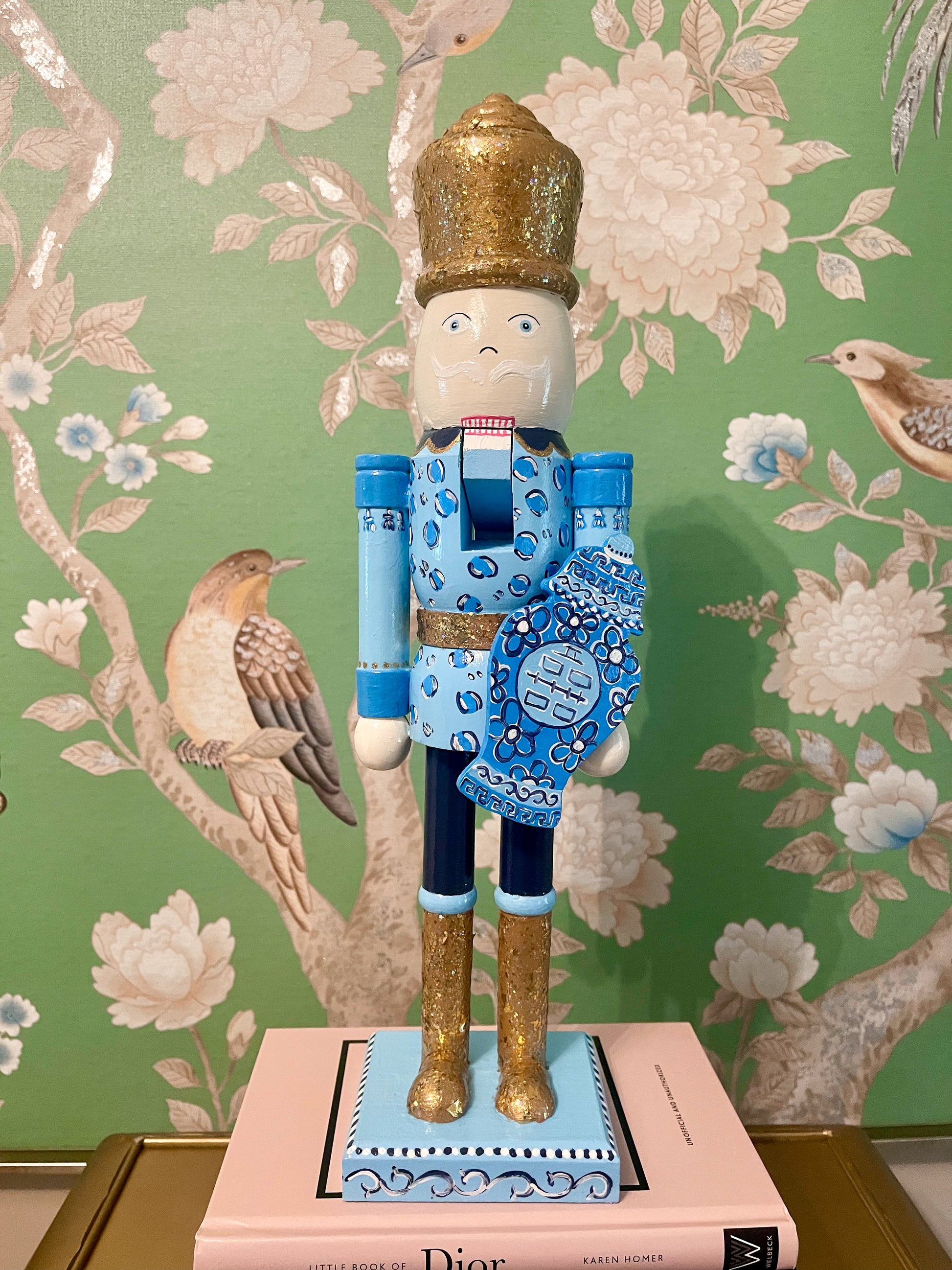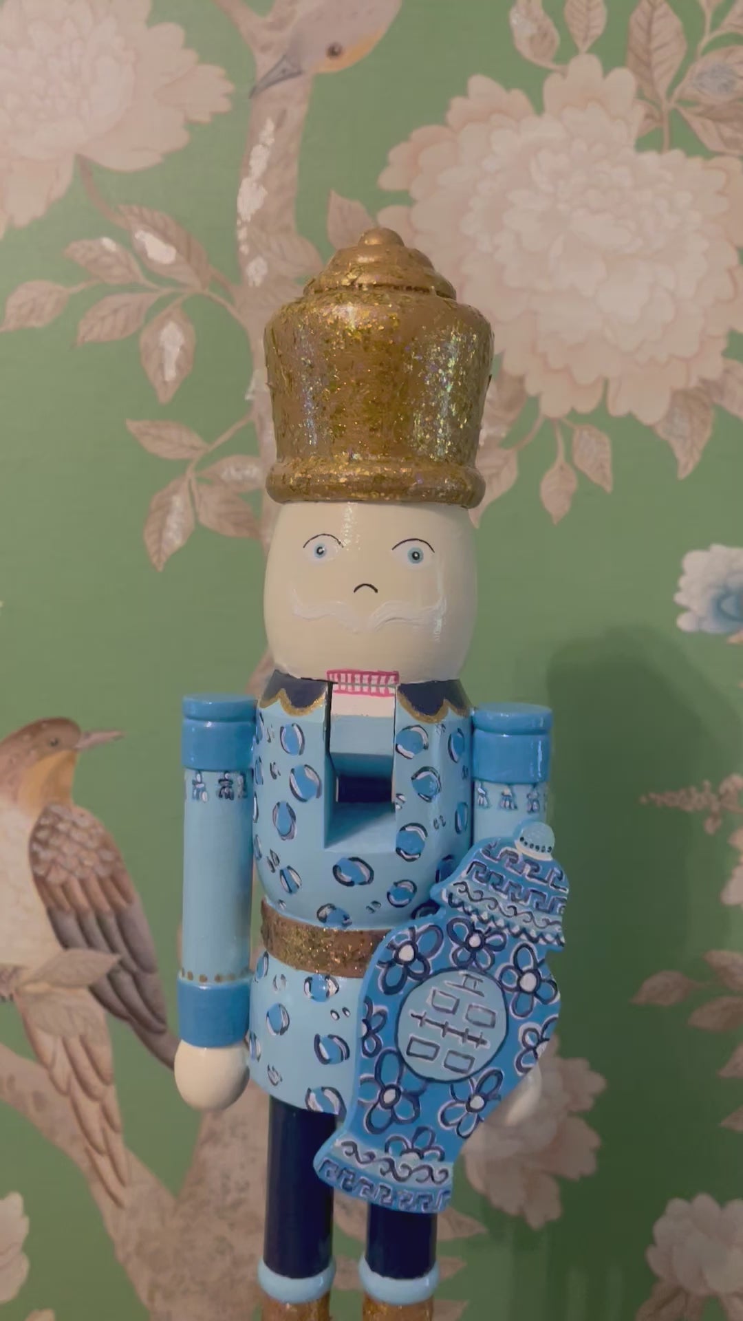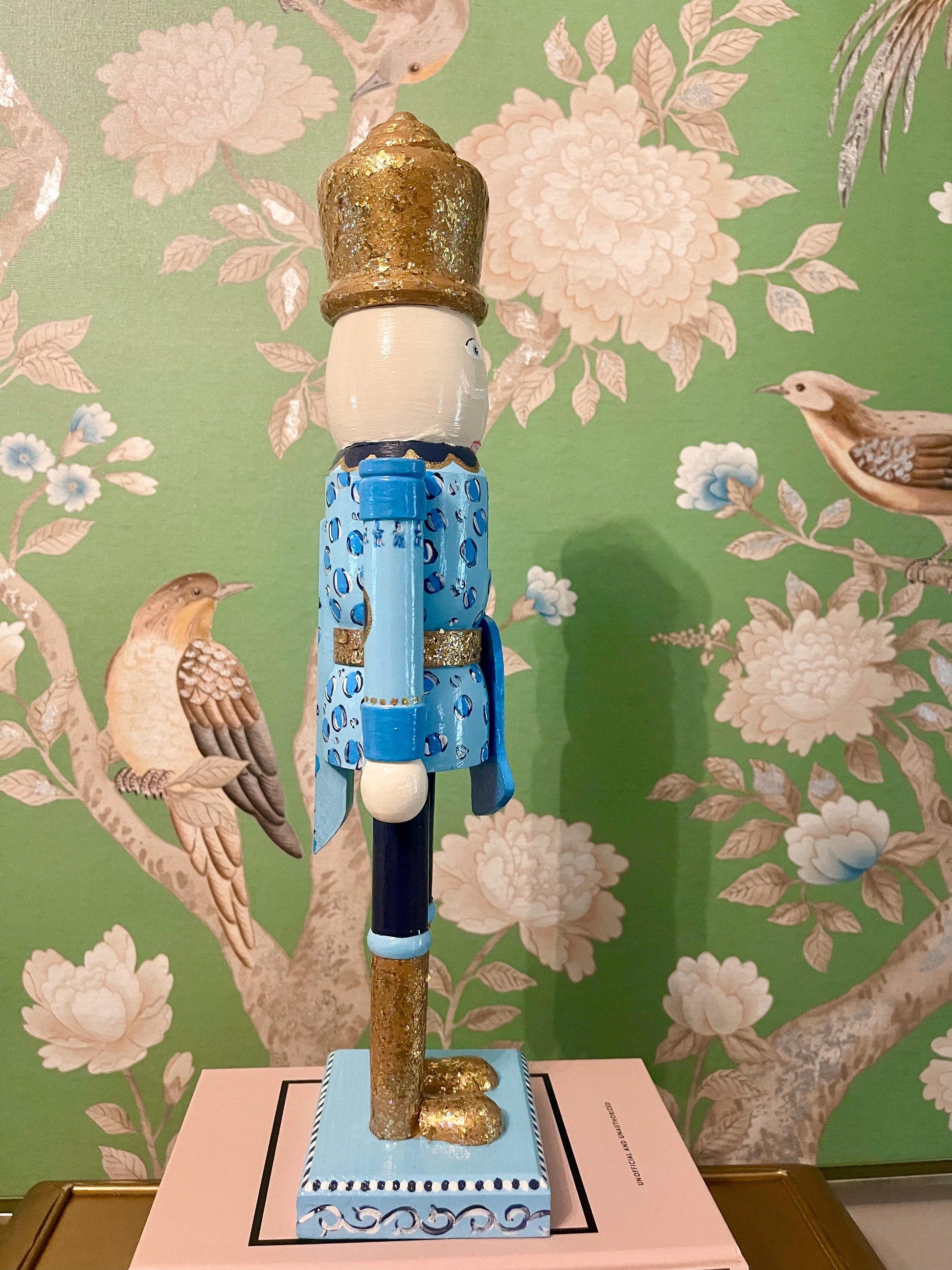 hand painted blue leopard nutcracker holding a double happiness ginger jar. he is so so cute and so fun! he is a one of a kind nutcracker and we only have one available so grab him while you can!