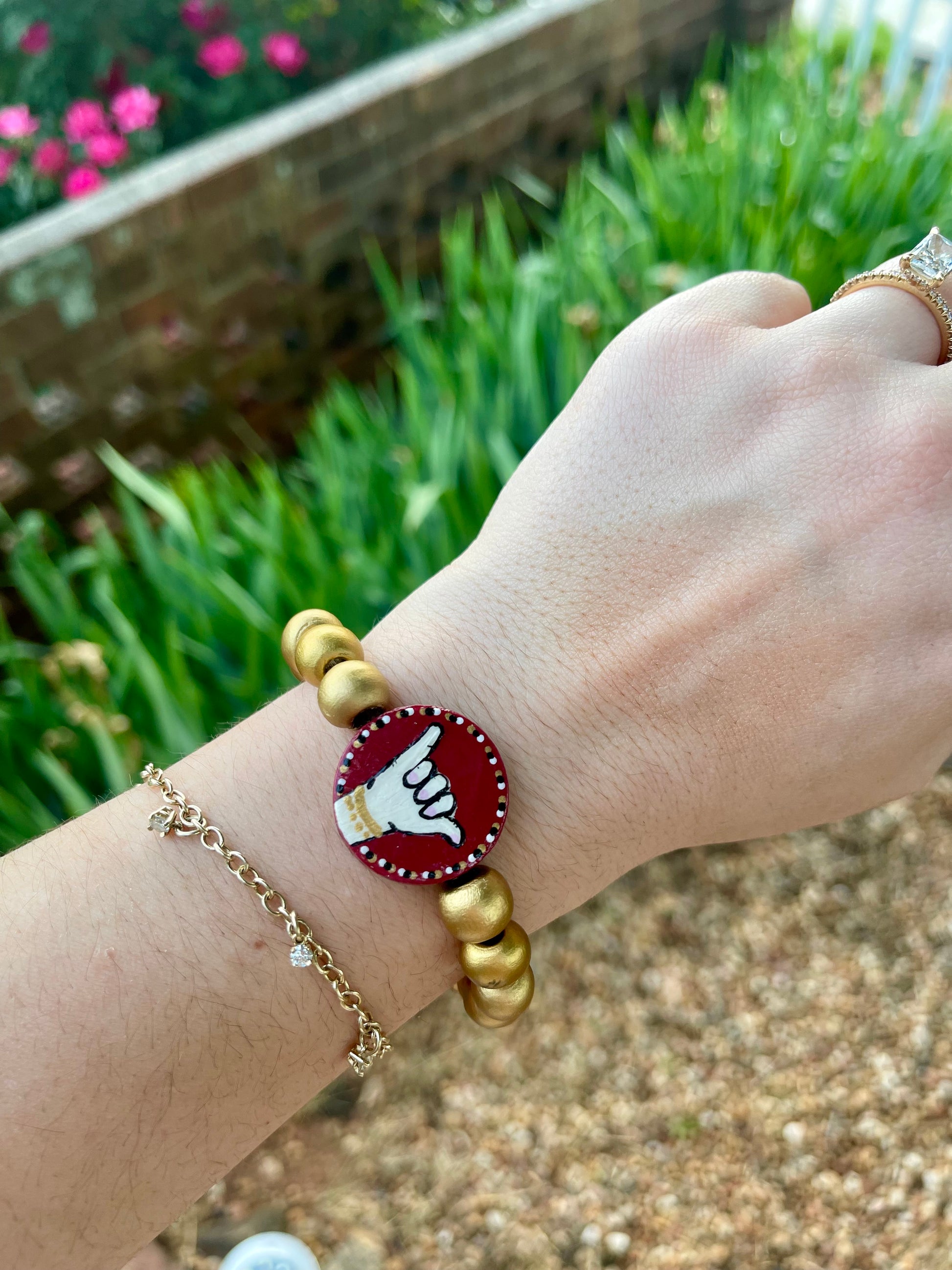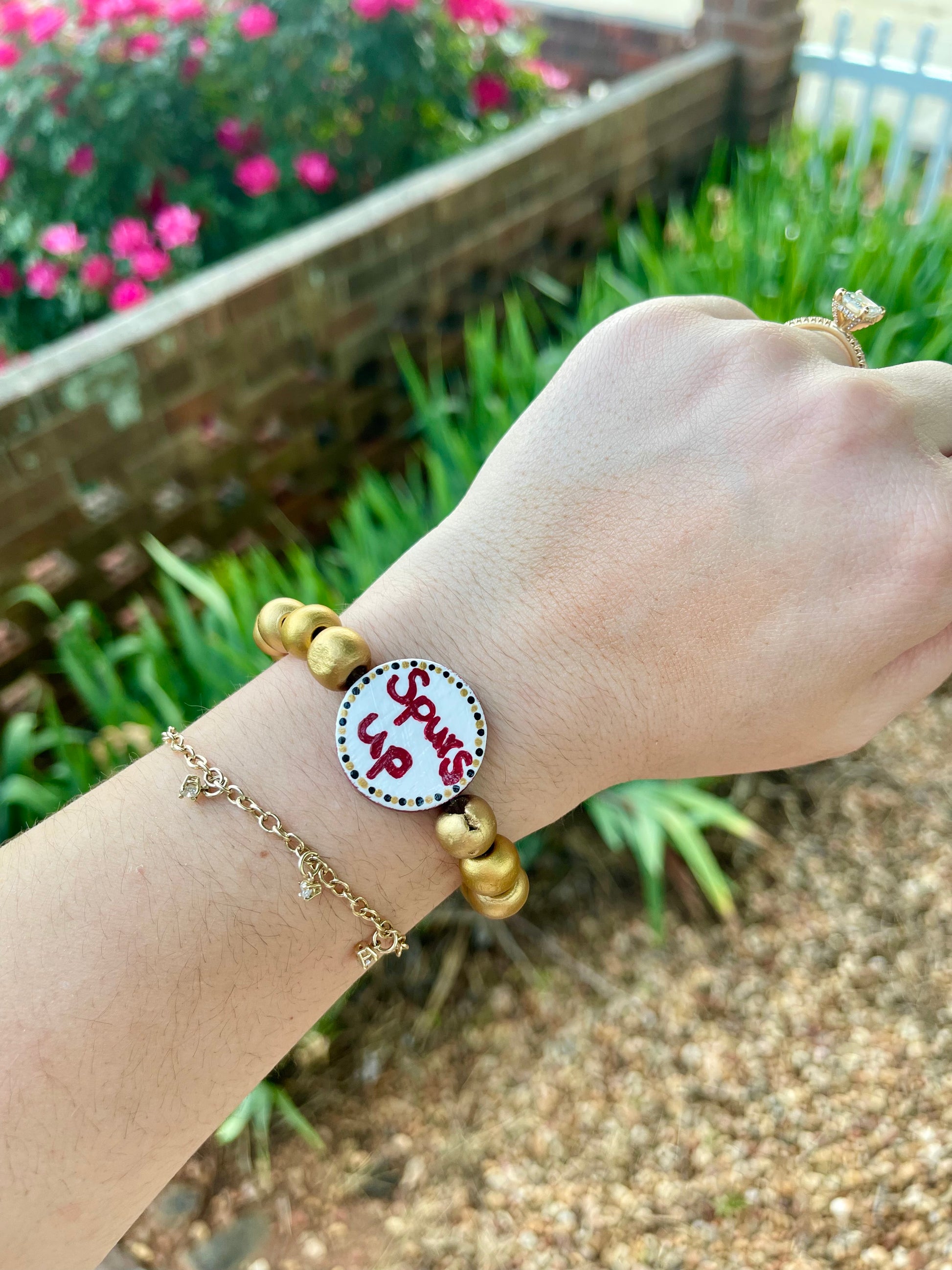 hand painted university of south carolina gamecocks flip bracelet. one side has the “spurs up” sign and the other side ssays “SPURS UP”. basically two bracelets in one!