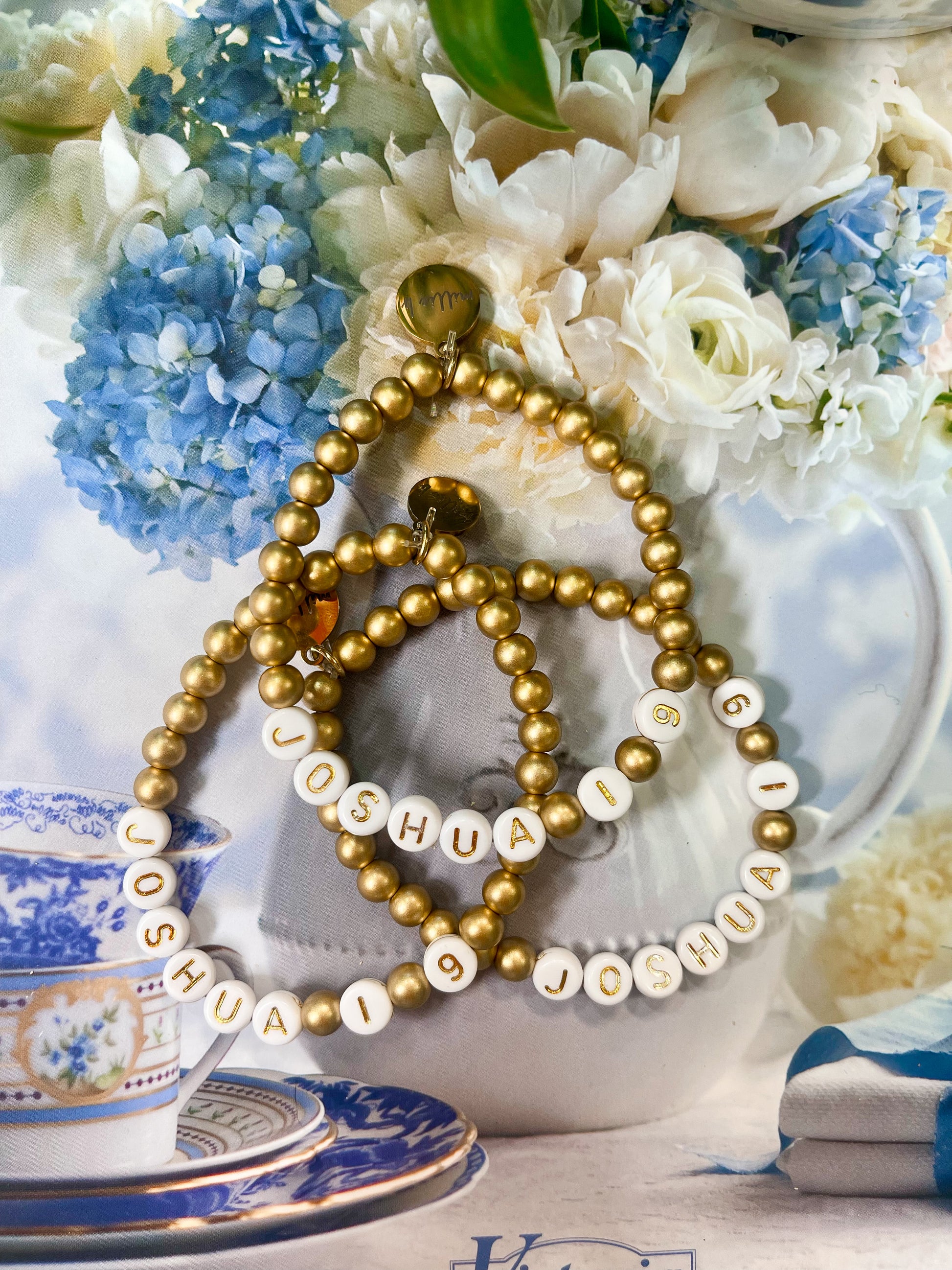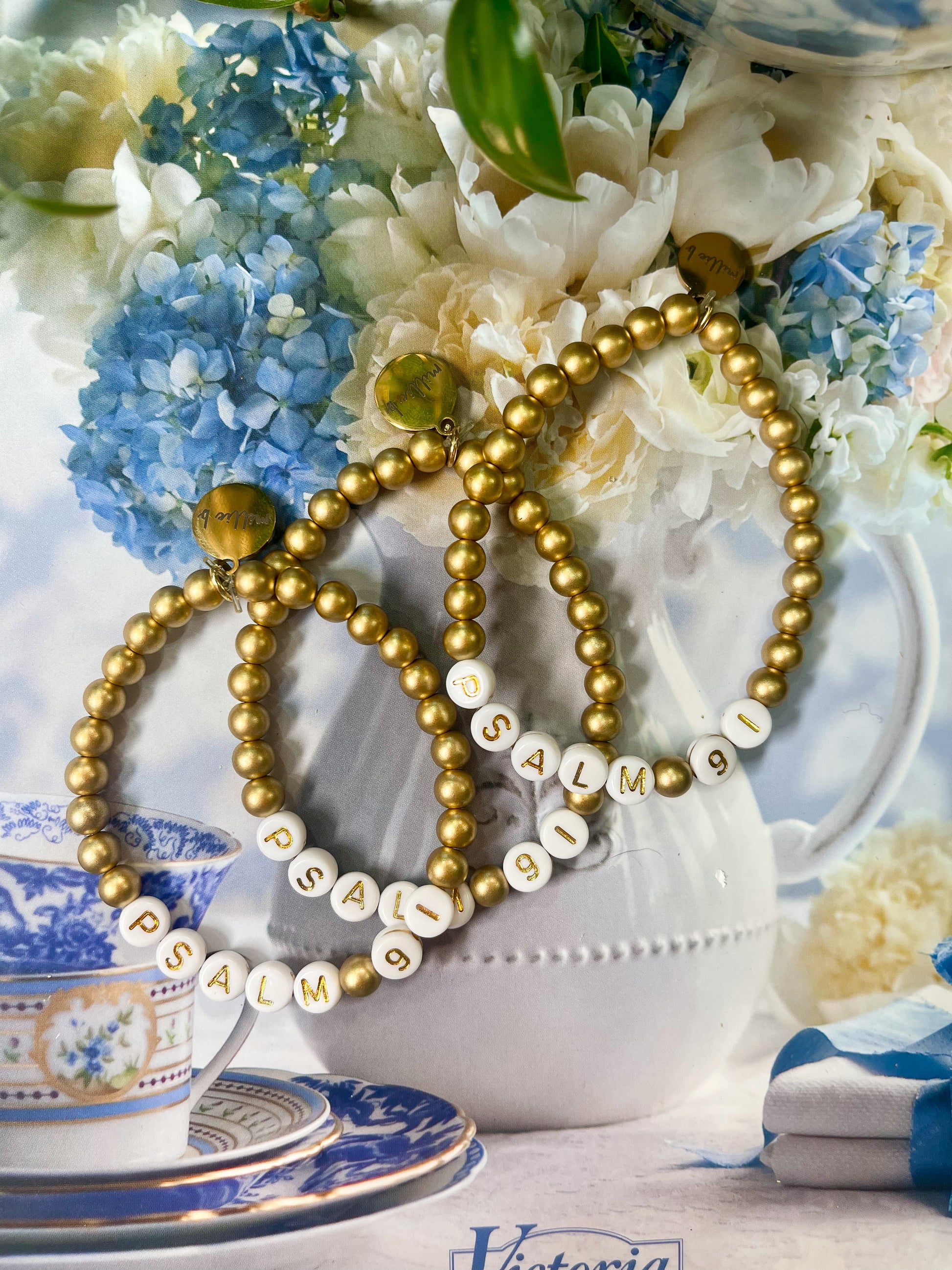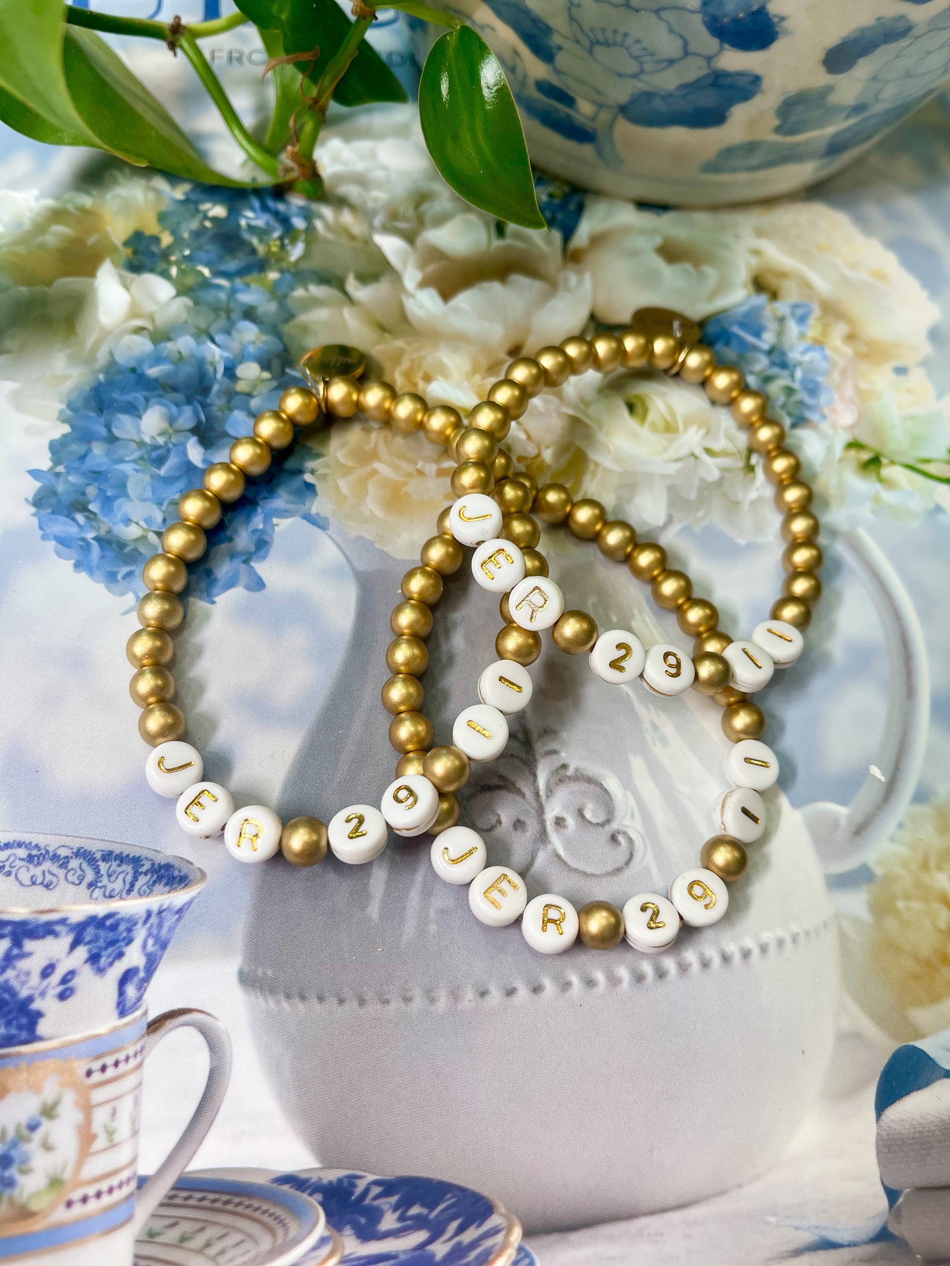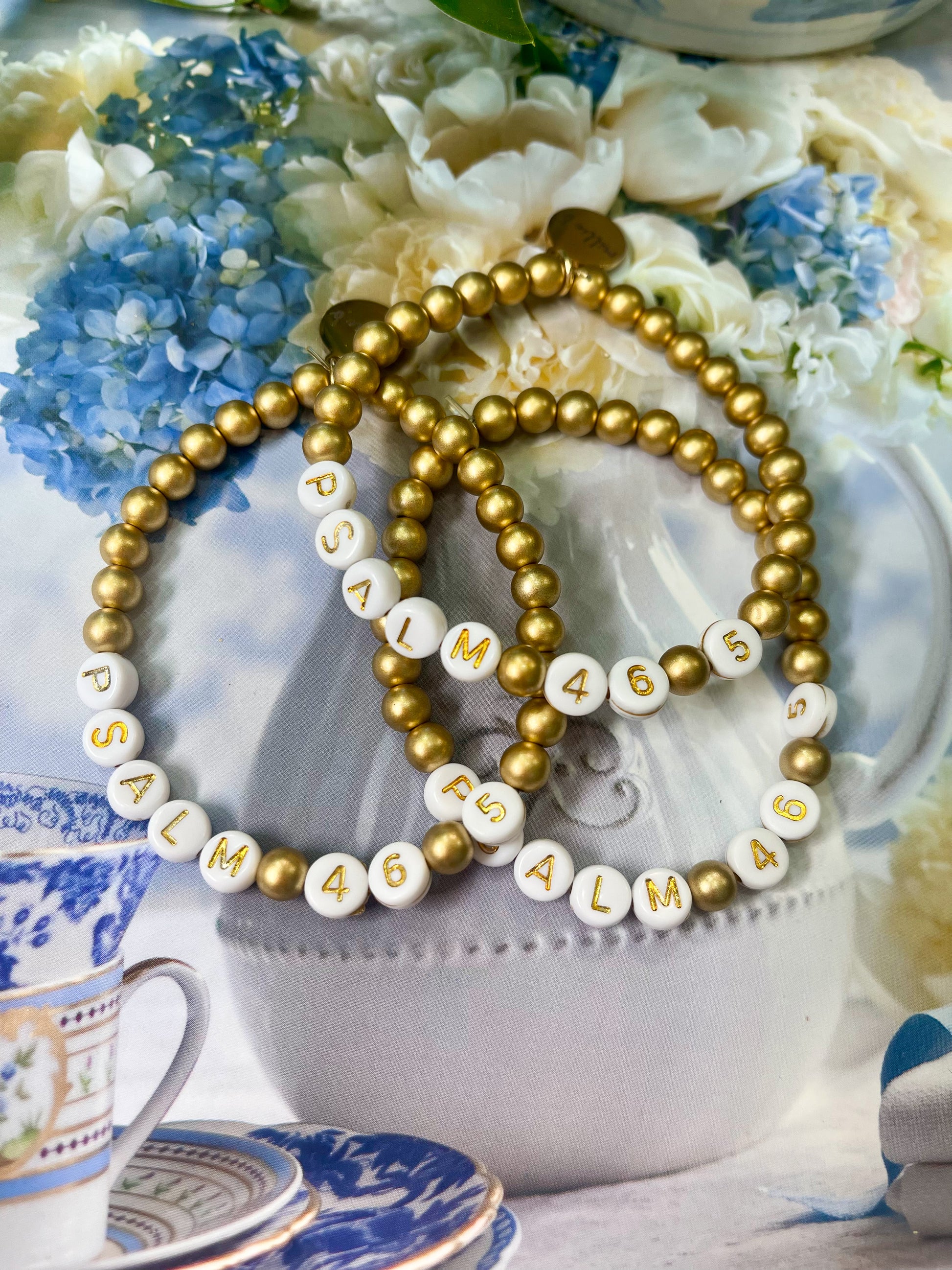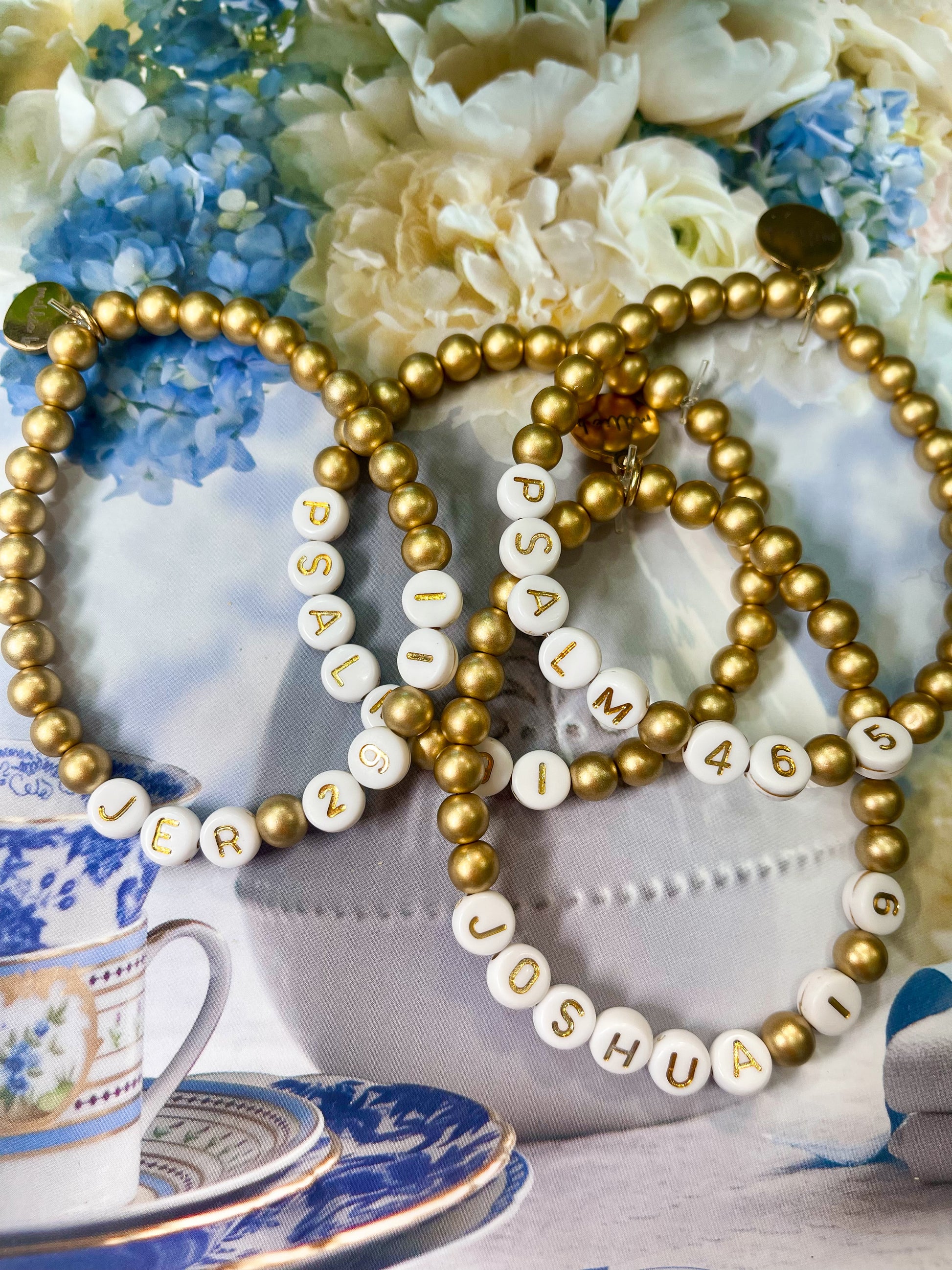 these gold letter bracelets with a favorite verse reference would be a sweet gift to anyone close to your heart! they are hand strung by us with gold metal beads