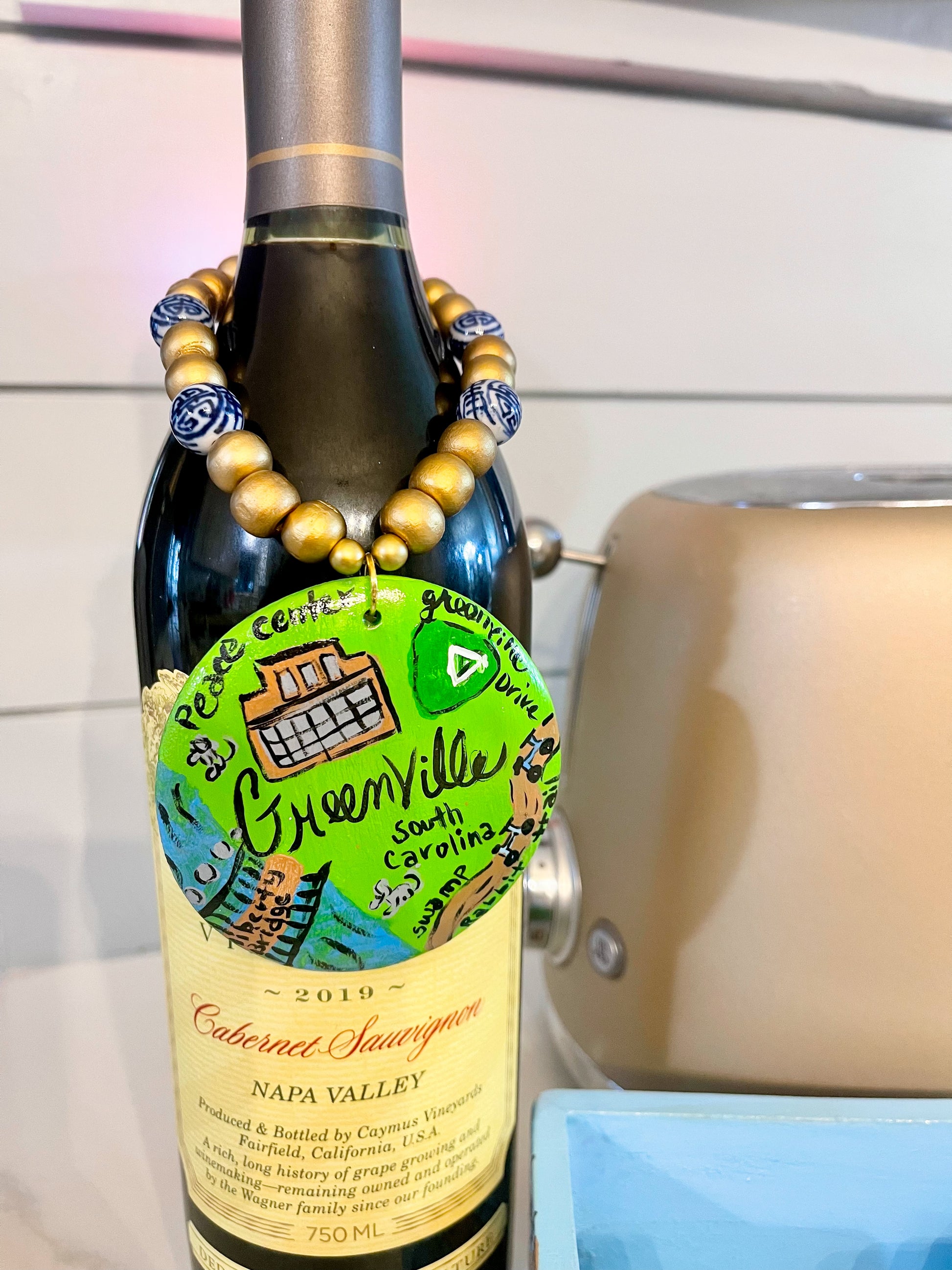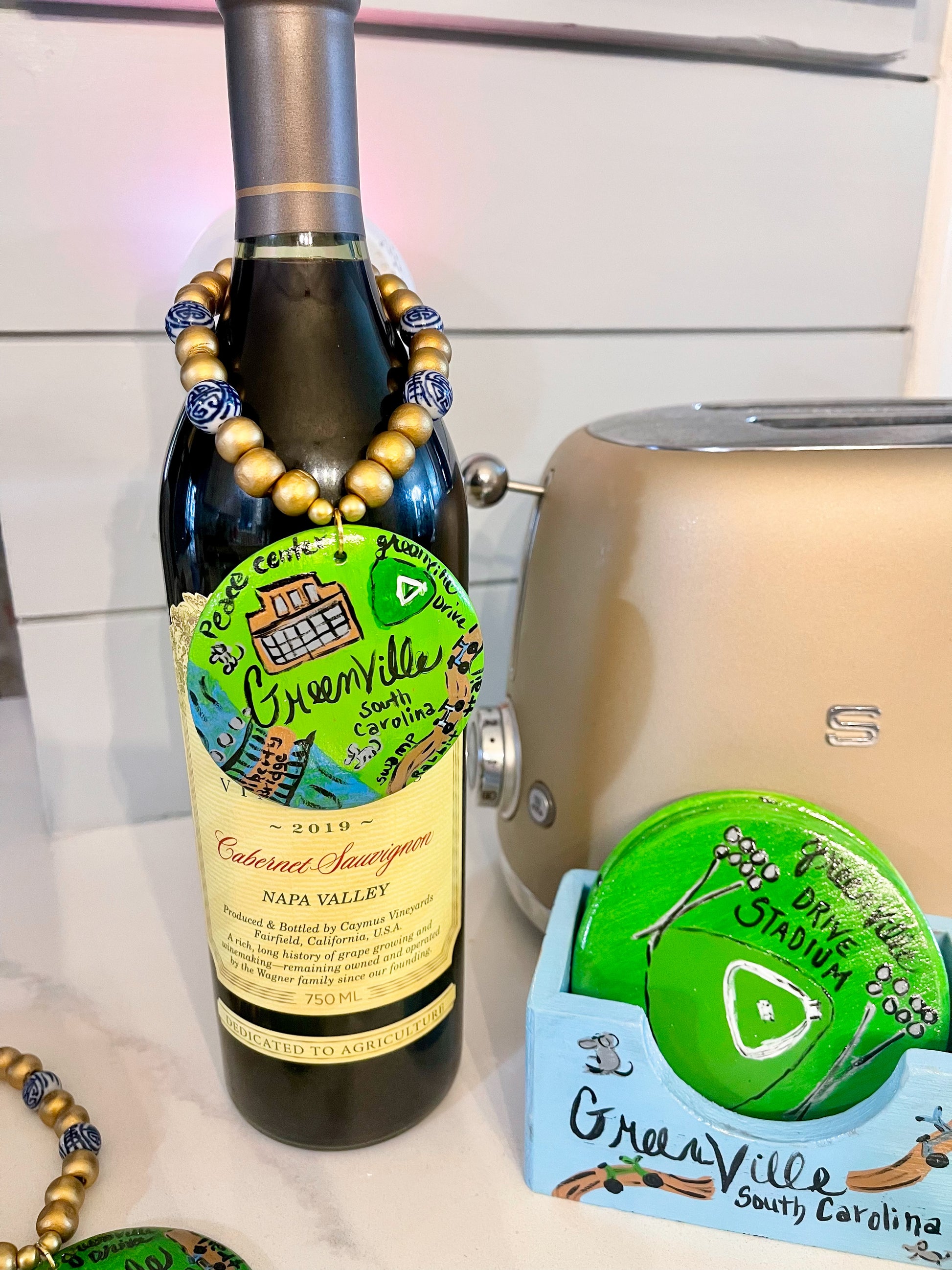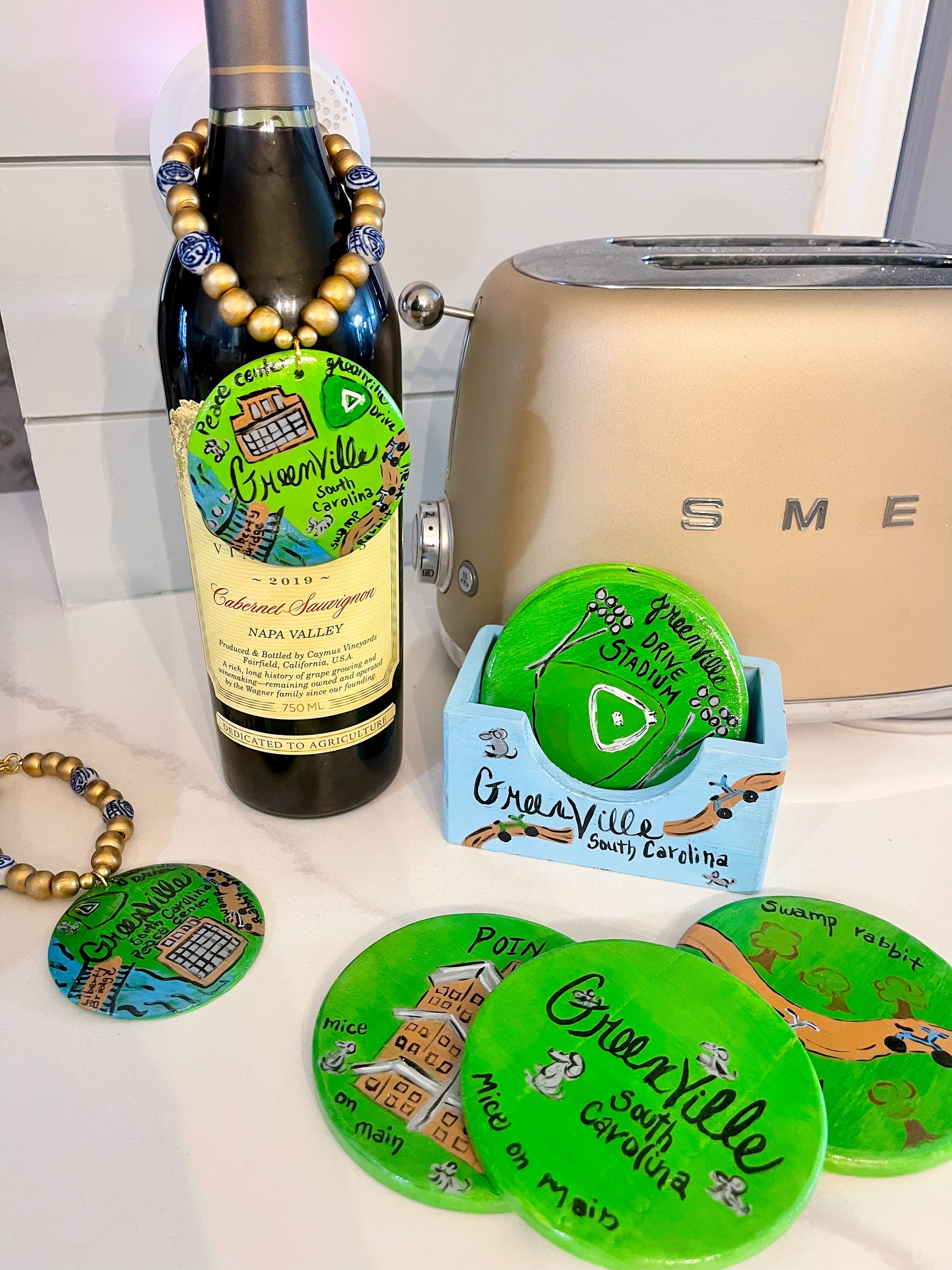 bring a pop of personality and local love to your tabletop! choose between one of our signature millie bling wine bottle (or ginger jar) tags—hand-painted with wooden beads and blue/white glass beads—or choose a vibrant collection of Greenville, South Carolina scenic coasters…. or grab both while you can! each coaster showcases a beloved local landmark, from falls park to fluor field and the iconic “mice on main.” perfect for gifting, hosting, or showing off your southern pride with charm and color.