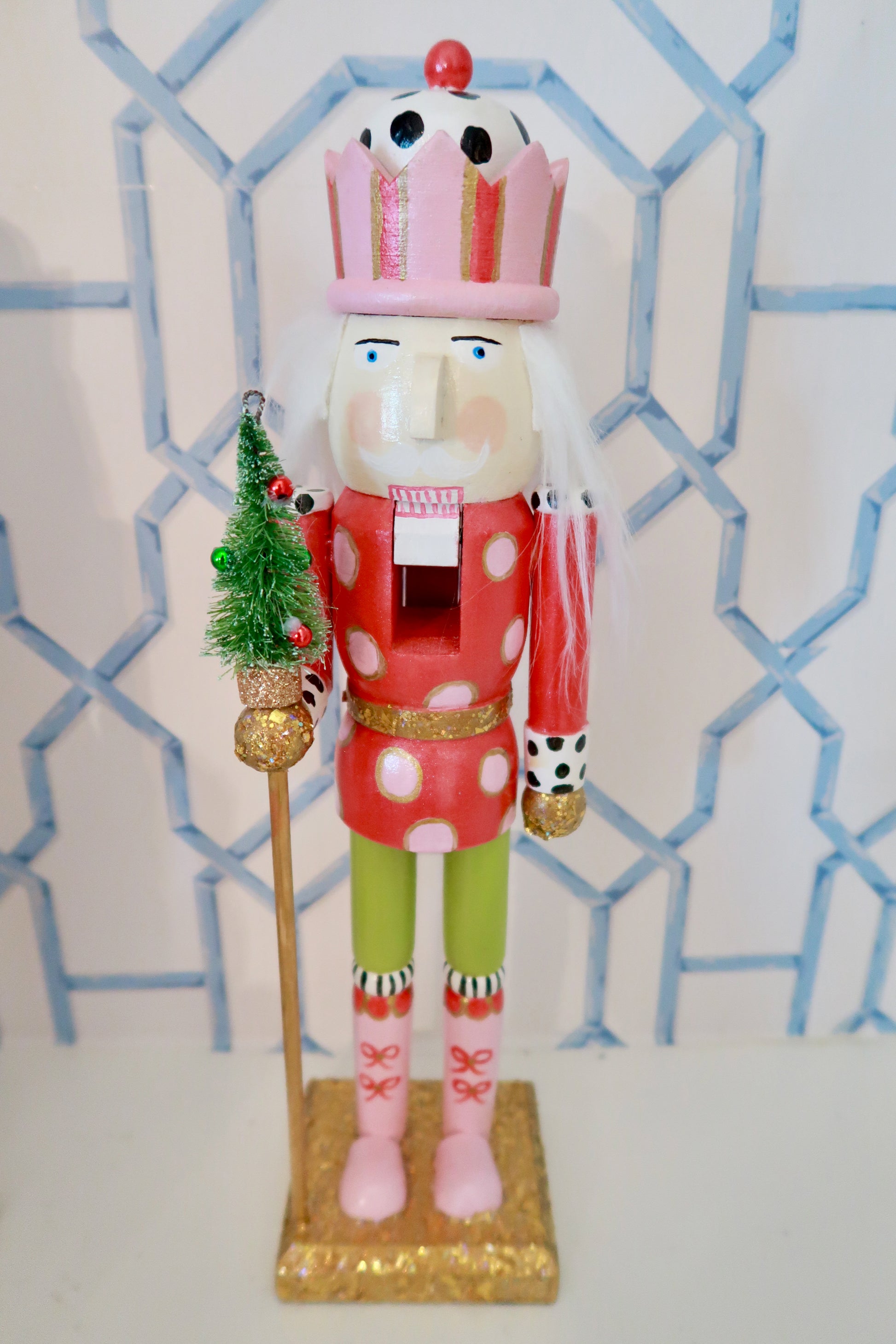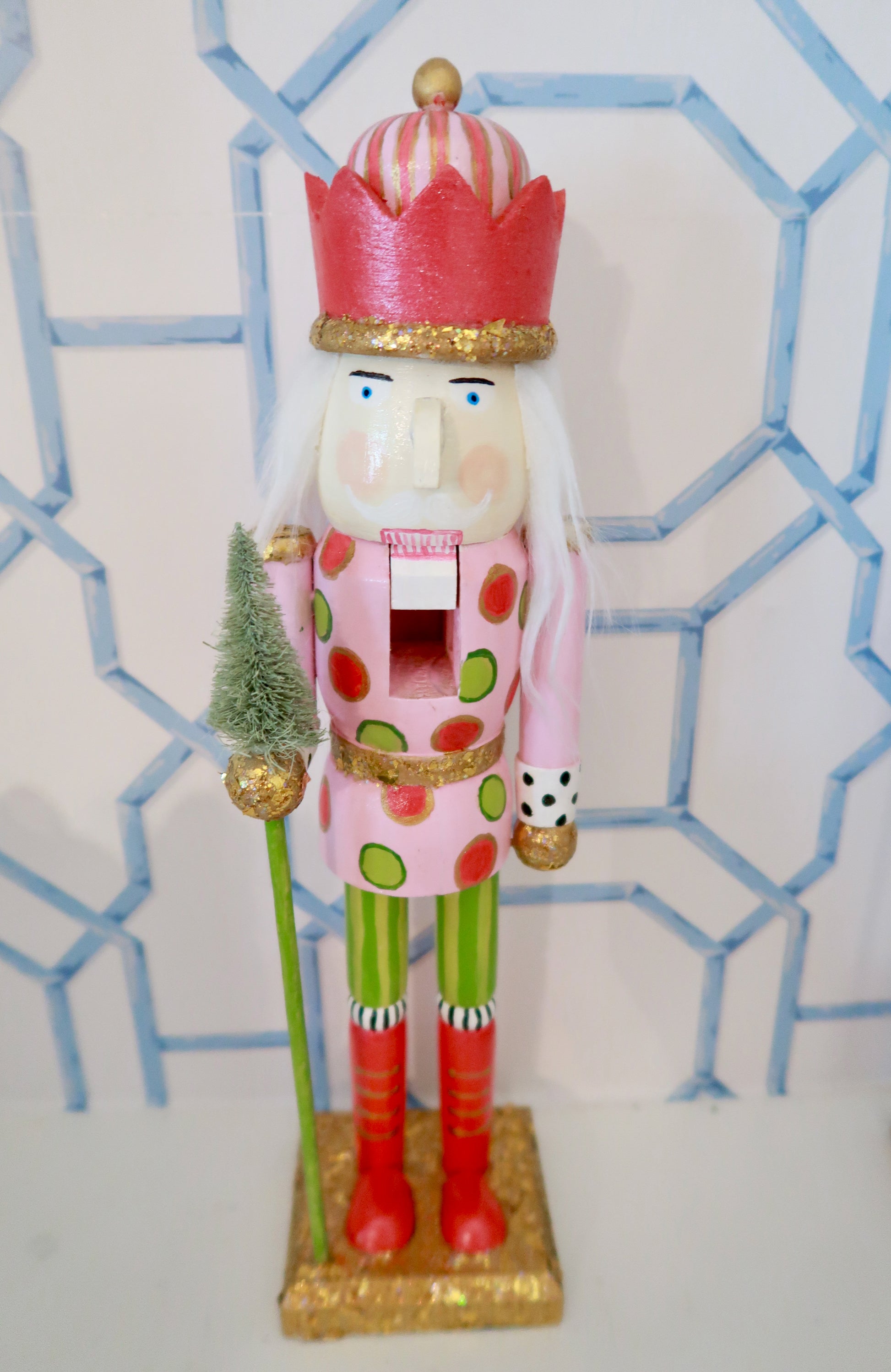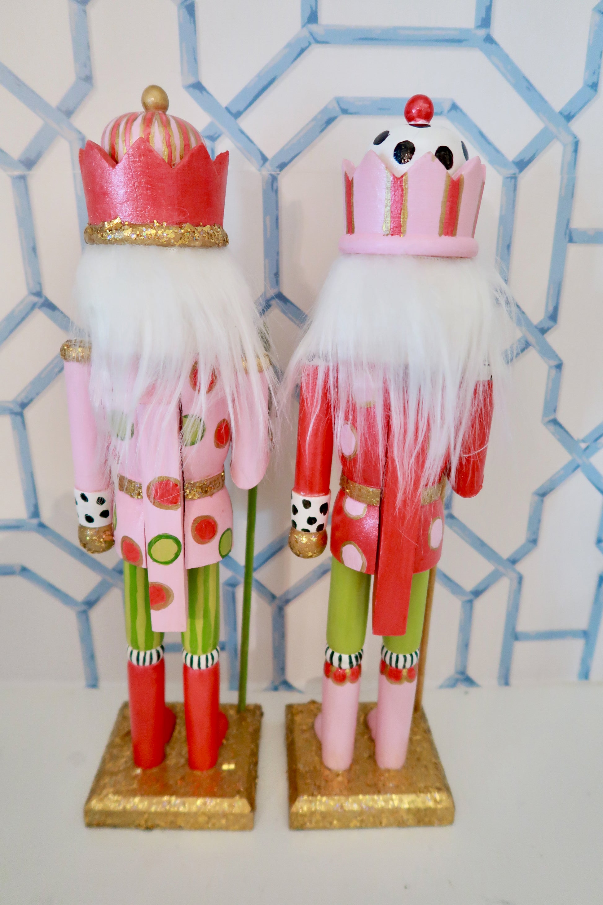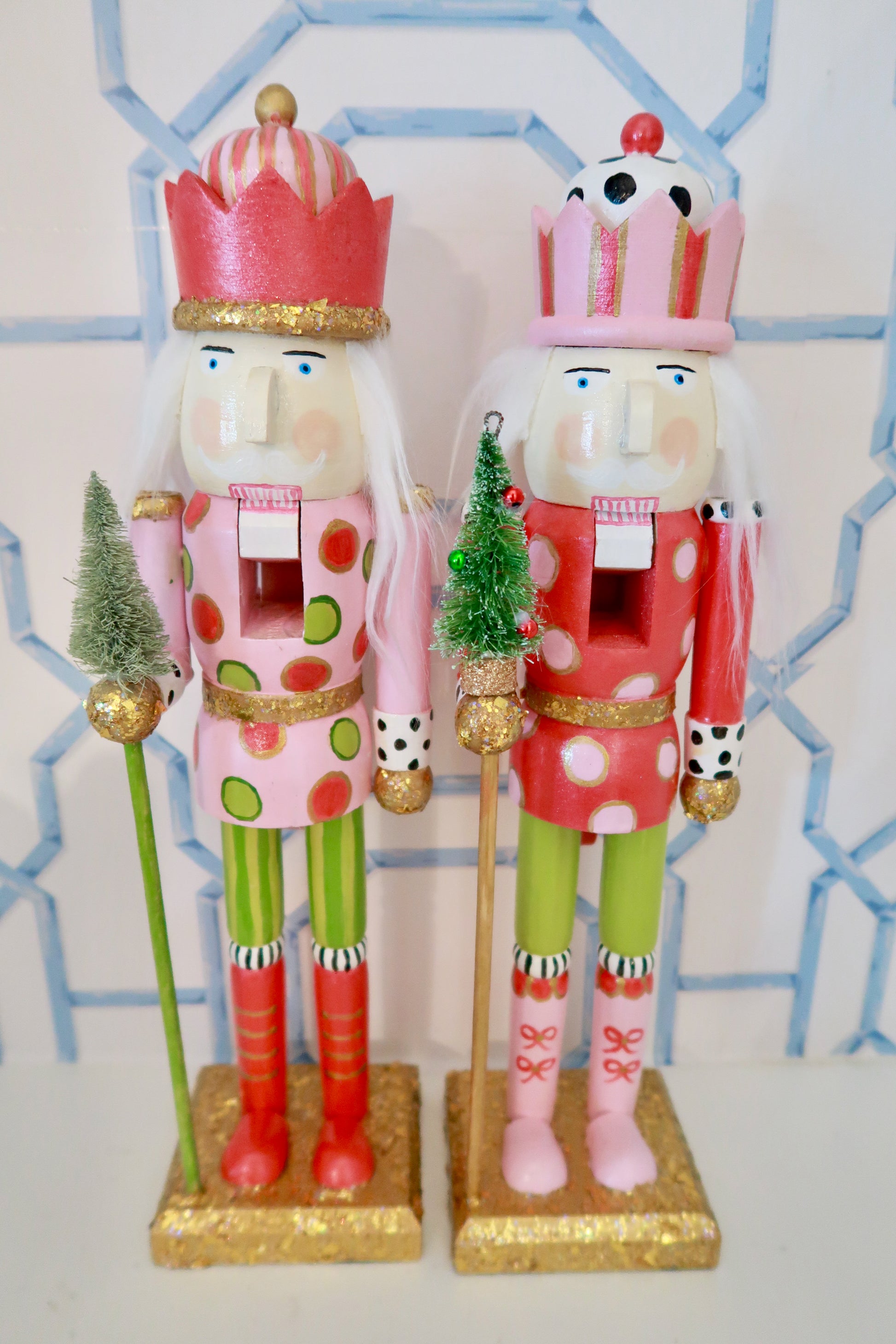 add a playful pop of pink and green to your holiday decor with our holly jolly jingle nutcrackers. a pair of hand-painted nutcrackers holding festive bottlebrush trees and dressed in a whimsical mix of polka dots, stripes, and glittering gold.