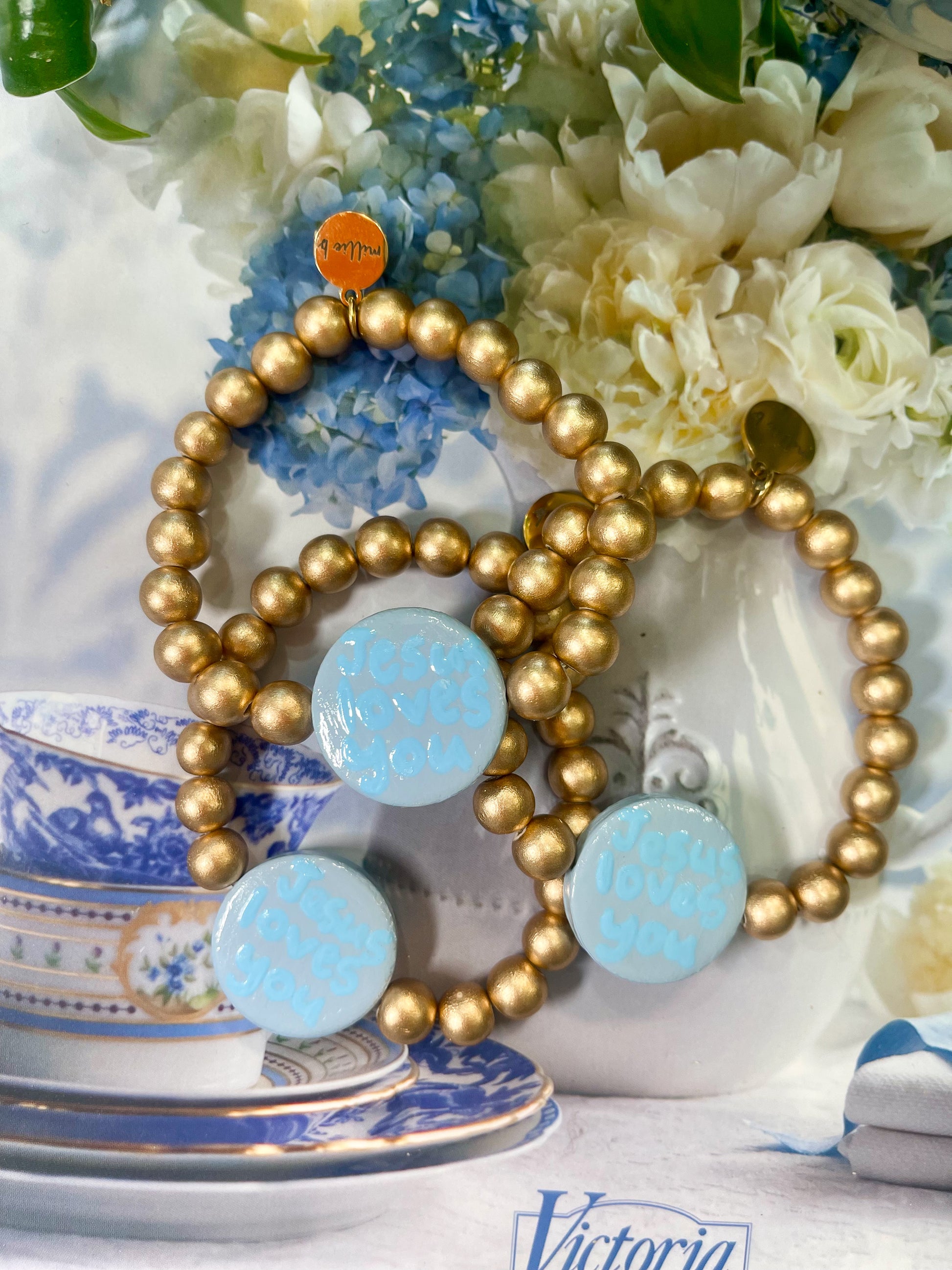 each disc is hand painted by us, glazed, then hand strung on with other gold, wooden beads.