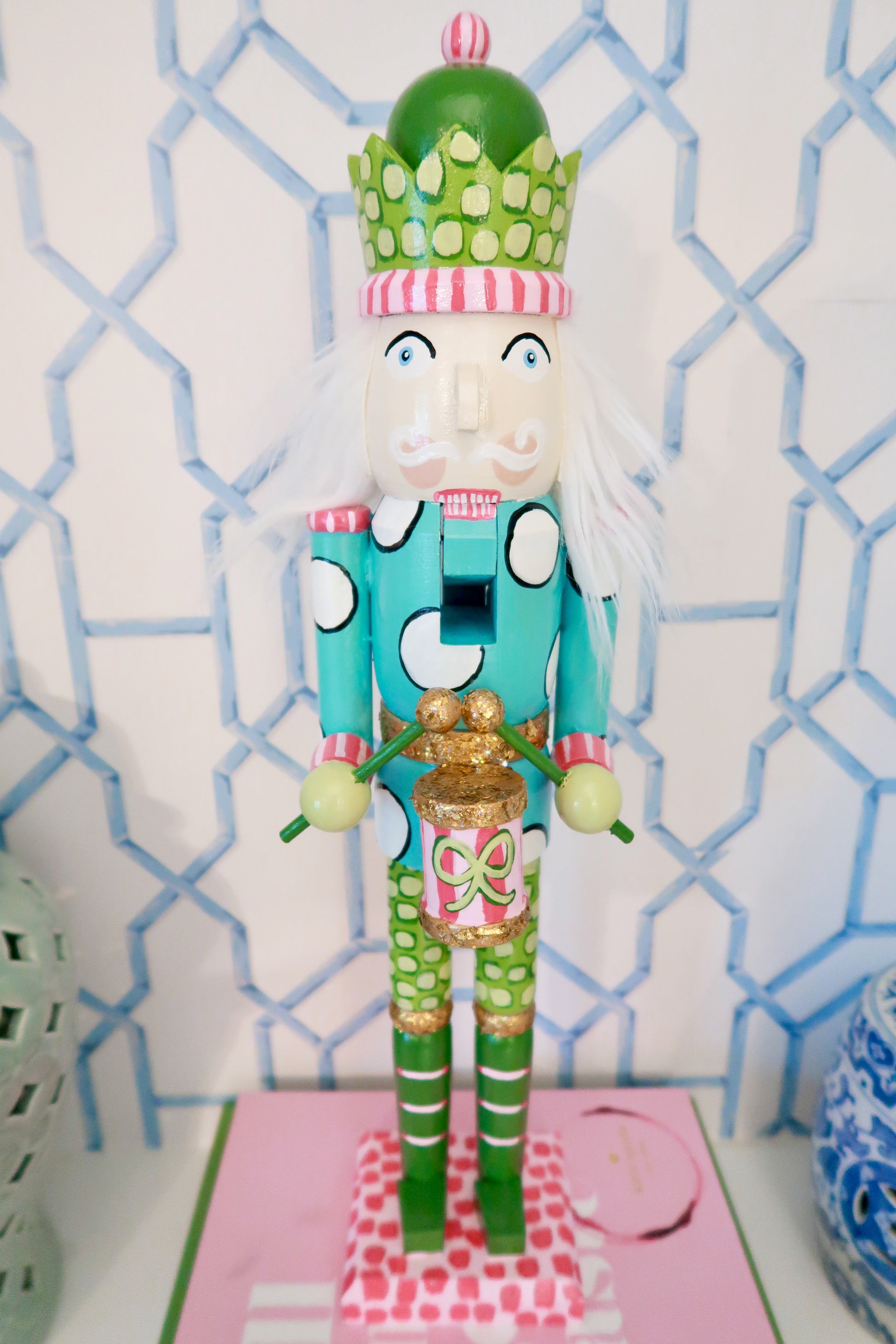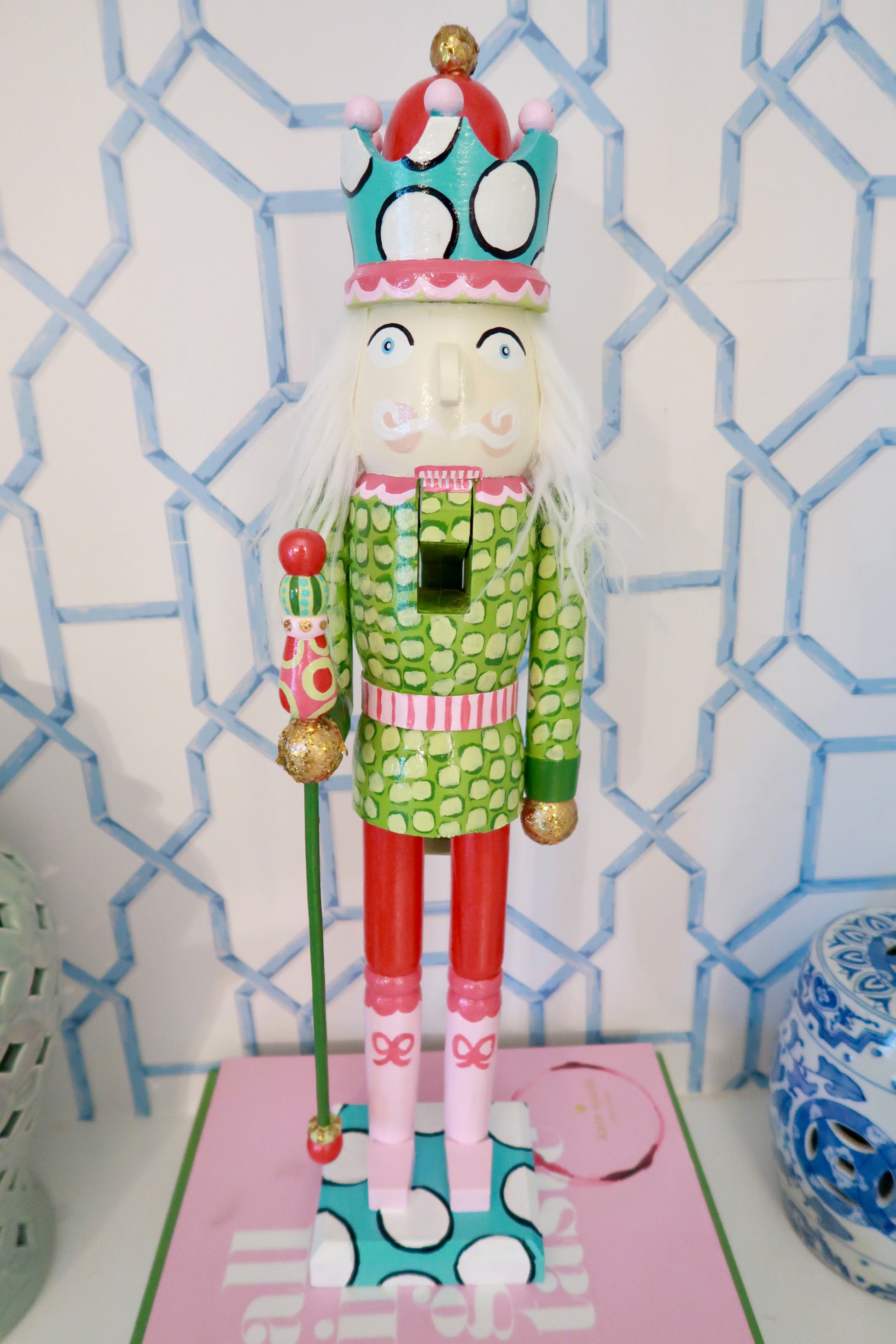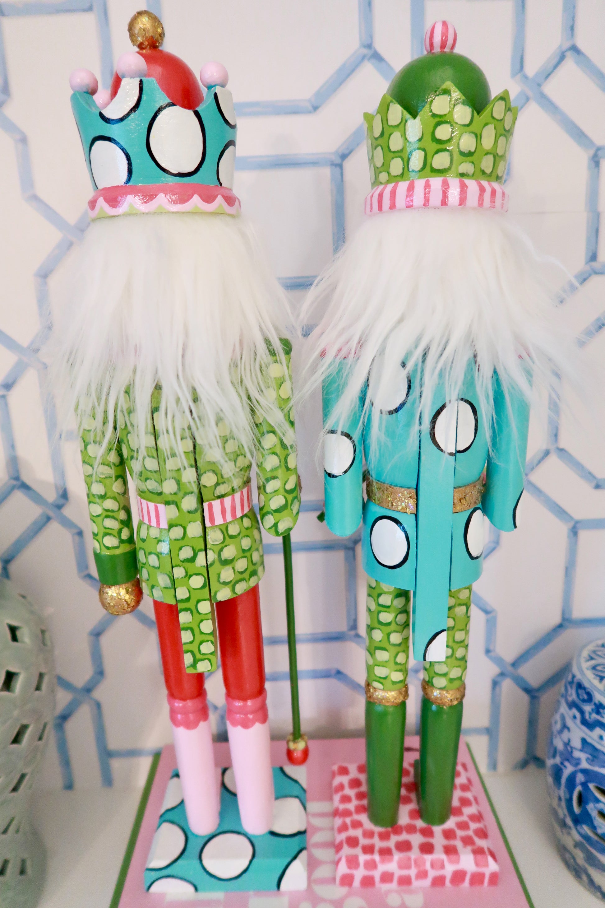 bring a pop of color and tradition to your holiday decor with our hand-painted nutcrackers. each piece is crafted with care in the USA, blending timeless heirloom style with playful patterns and cheerful details. from the bold polka dots to the gilded accents, these nutcrackers are made to be treasured year after year. perfect for gifting, collecting, or adding a touch of whimsy to your mantle or tablescape.