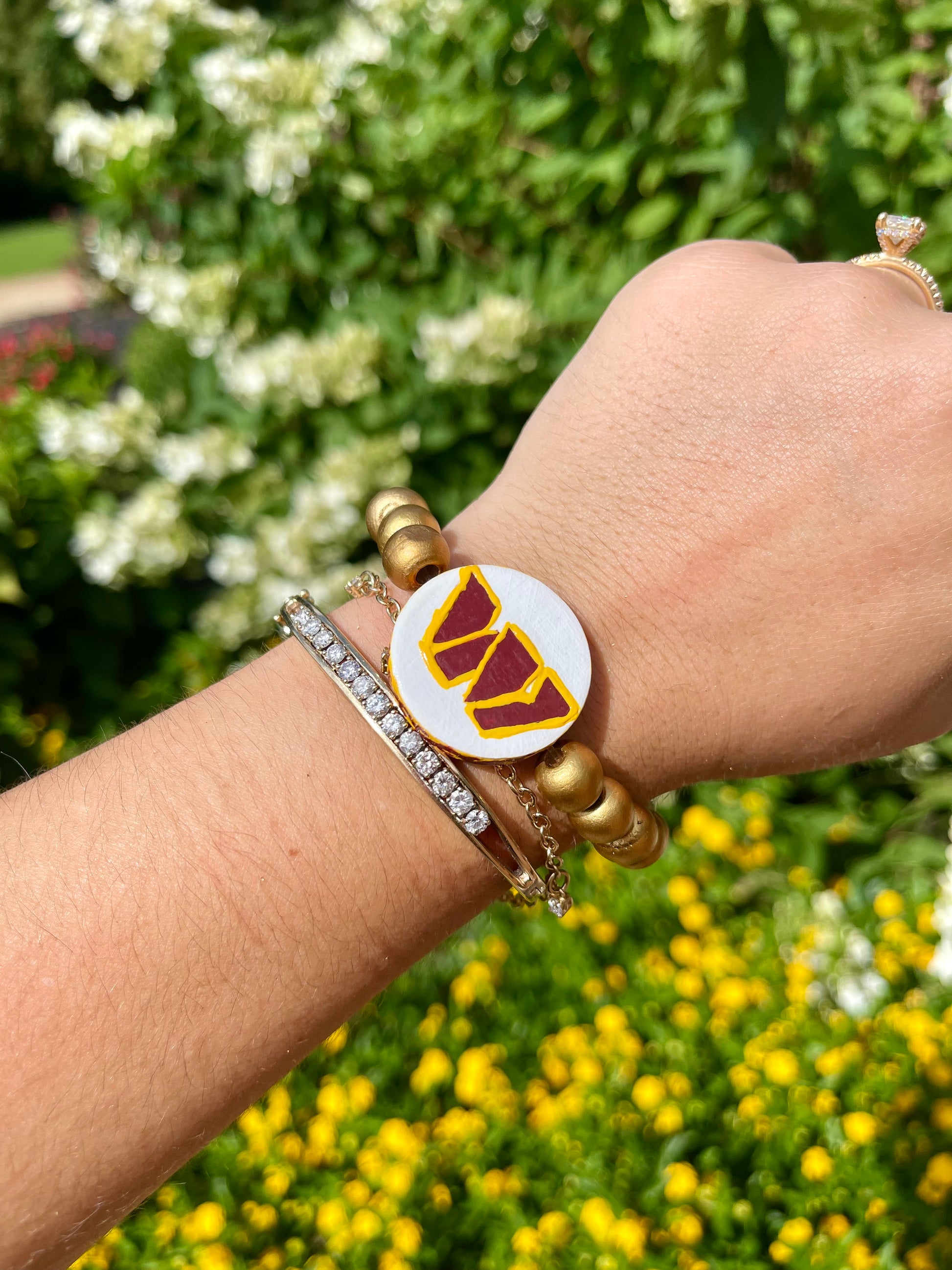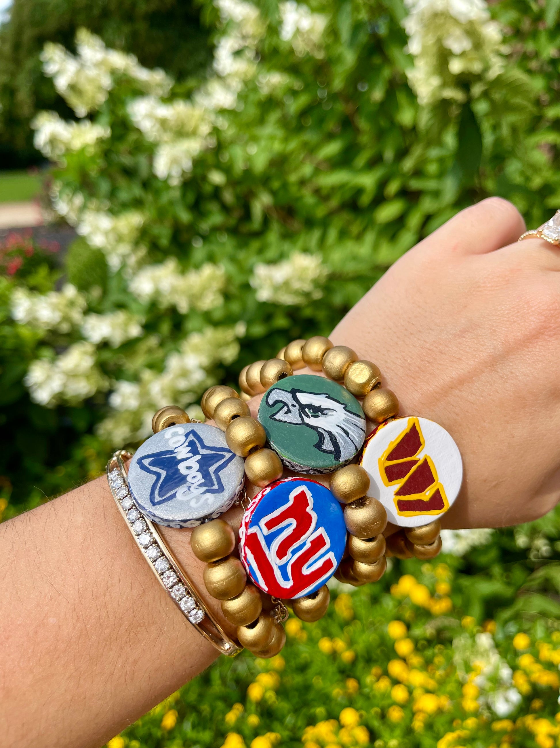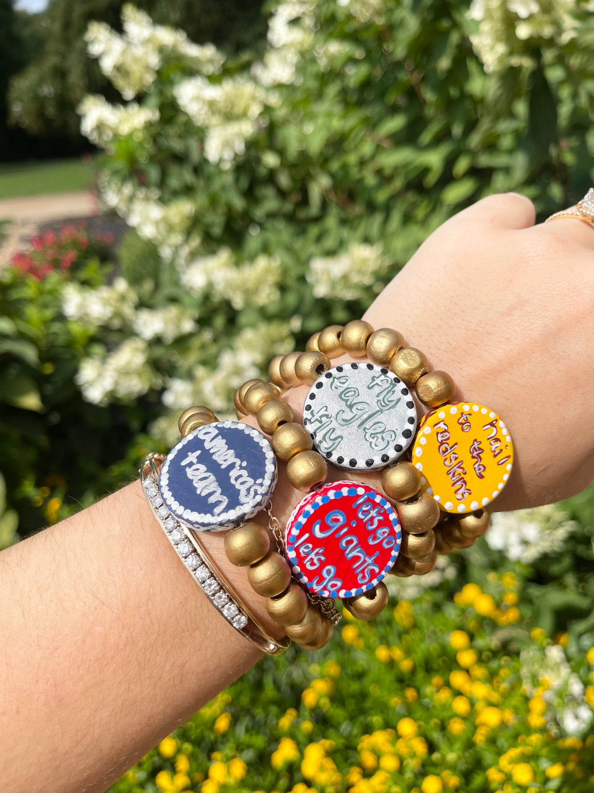 NFCE pro football flip bracelets. these hand painted bracelets have the team on one side and a popular phrase or chant on the other side. they are two bracelets for the price of one!