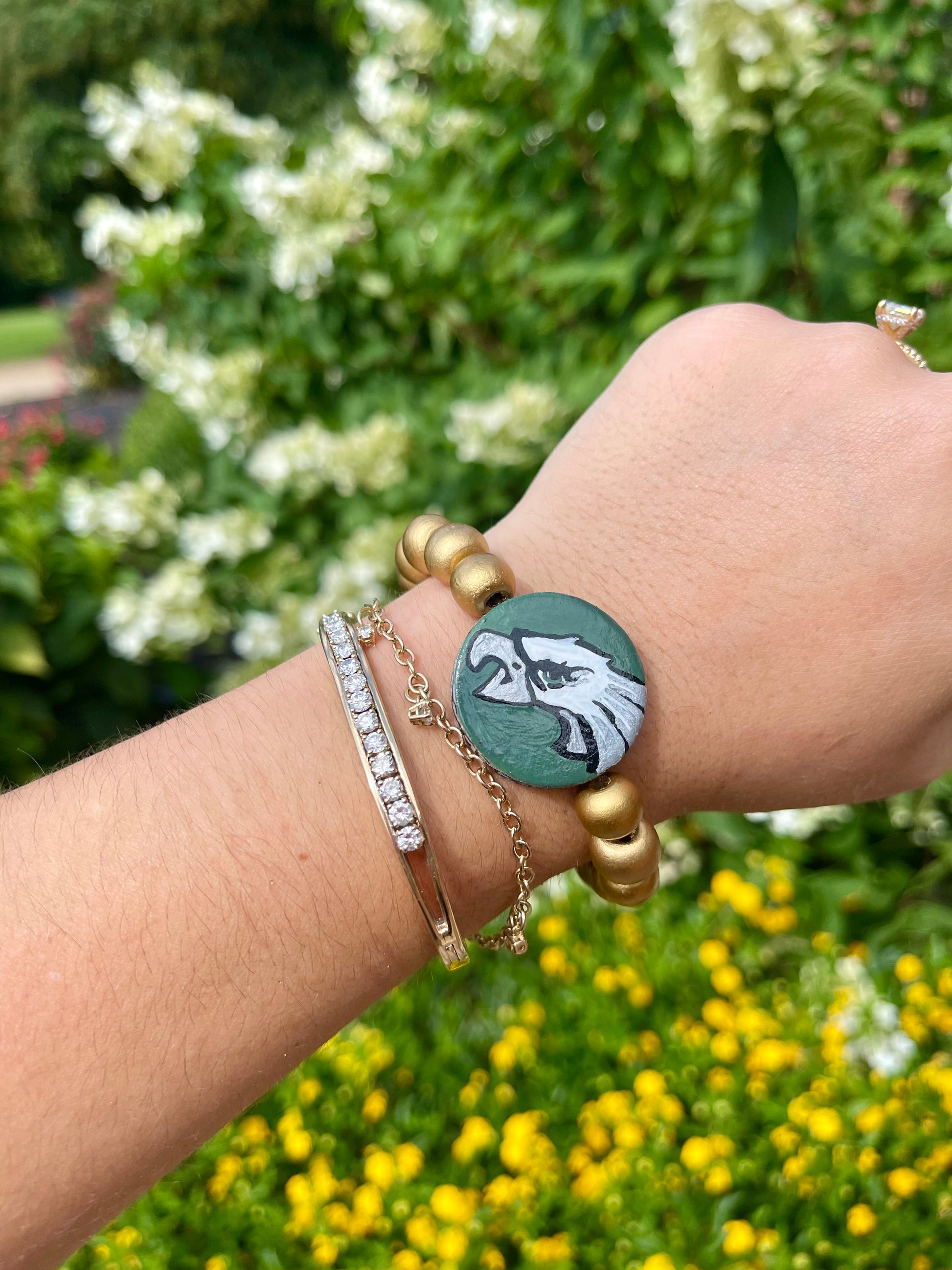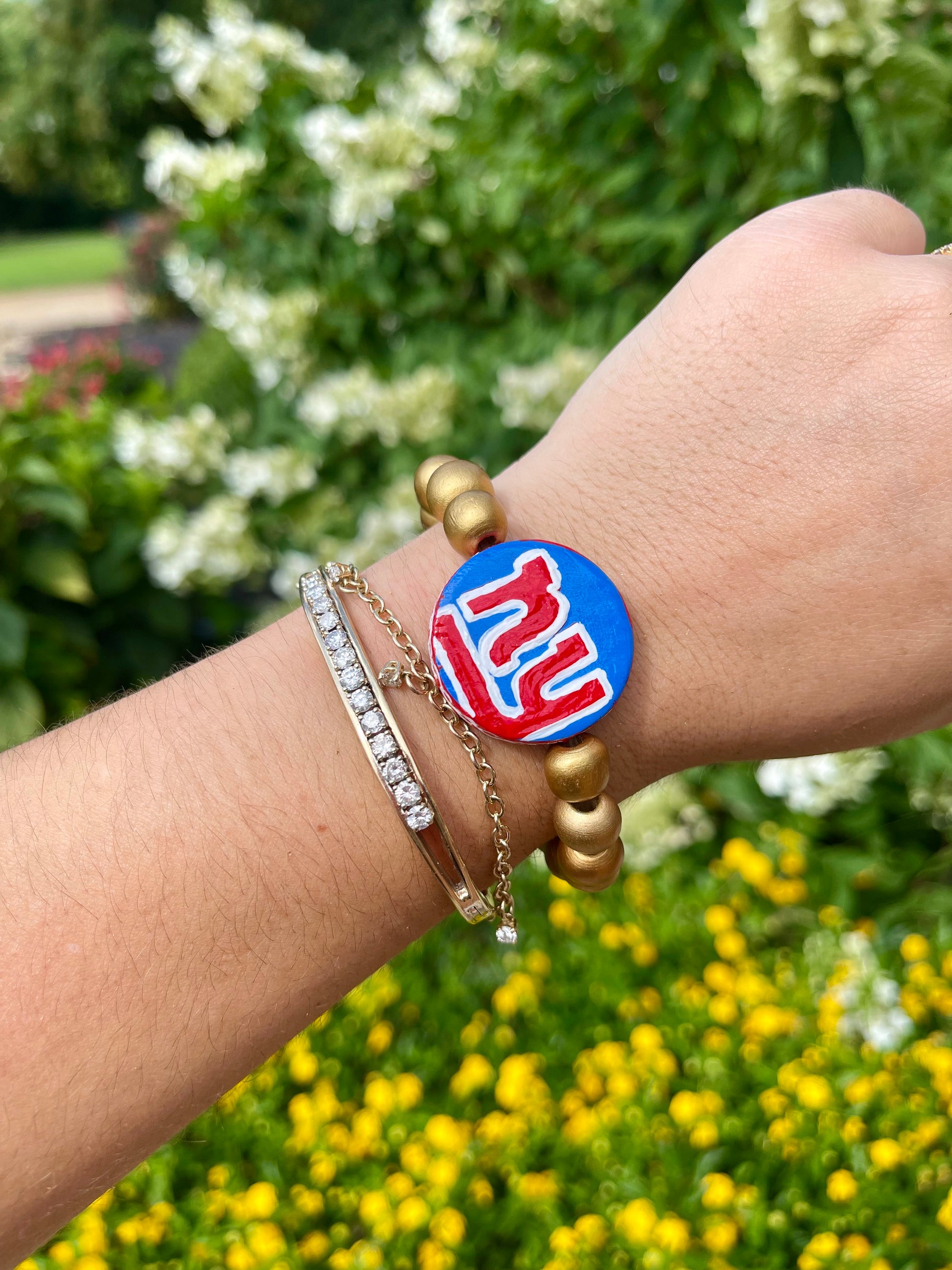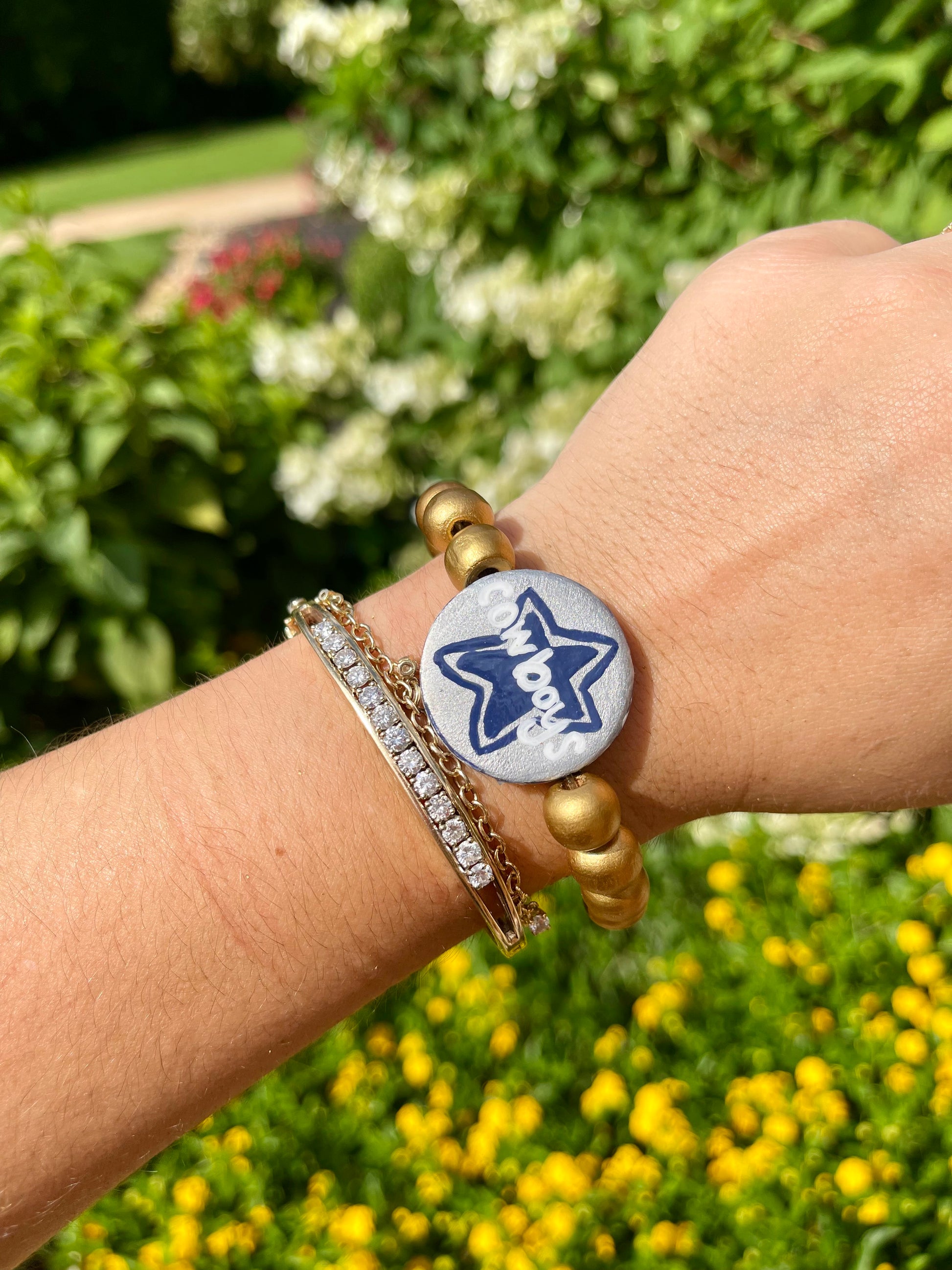NFCE pro football flip bracelets. these hand painted bracelets have the team on one side and a popular phrase or chant on the other side. they are two bracelets for the price of one!