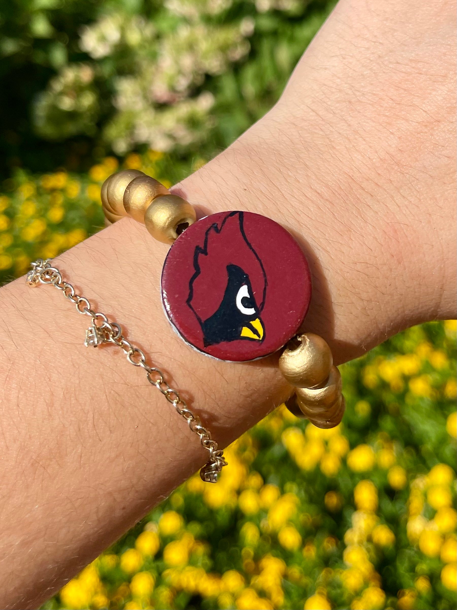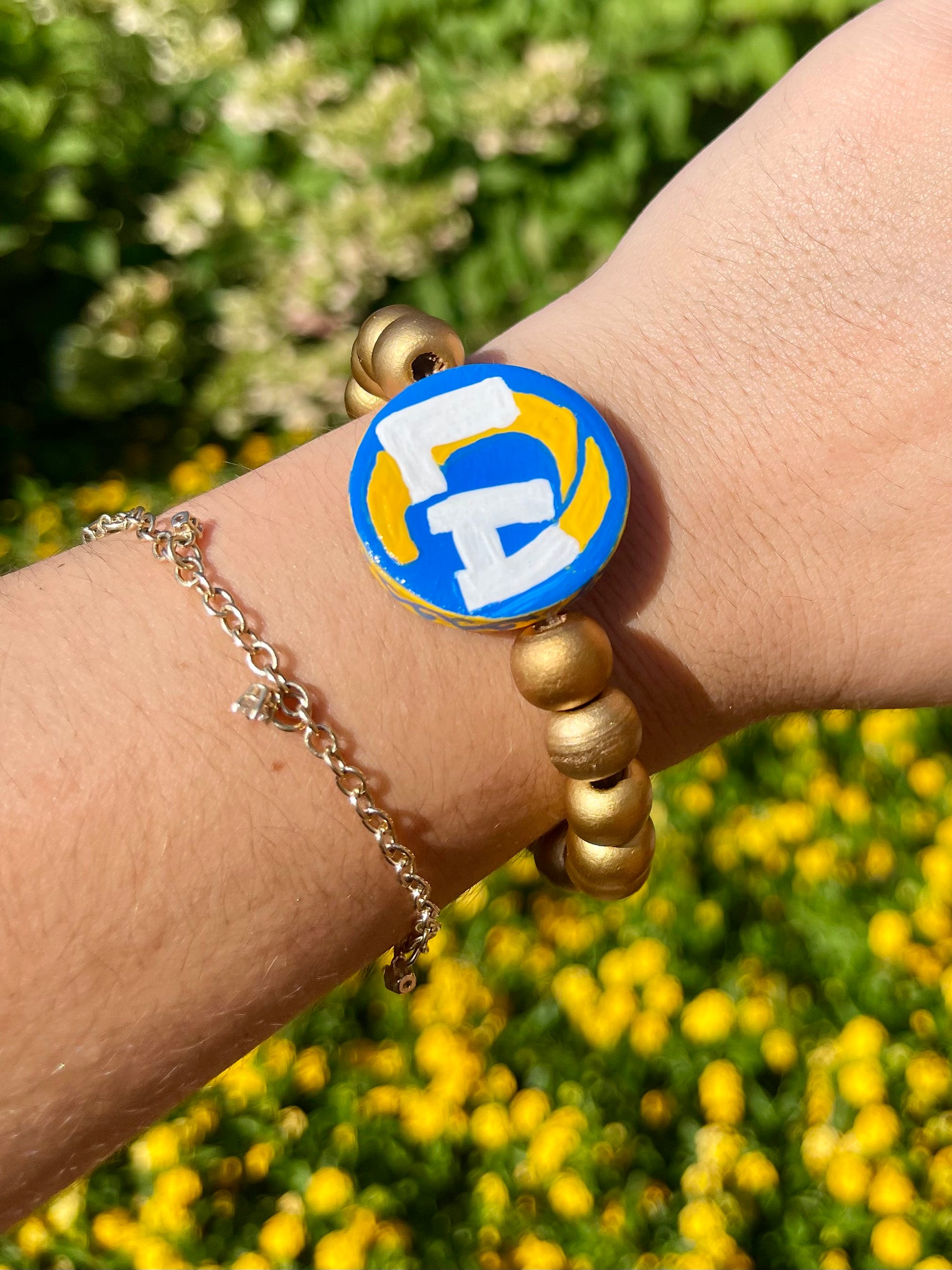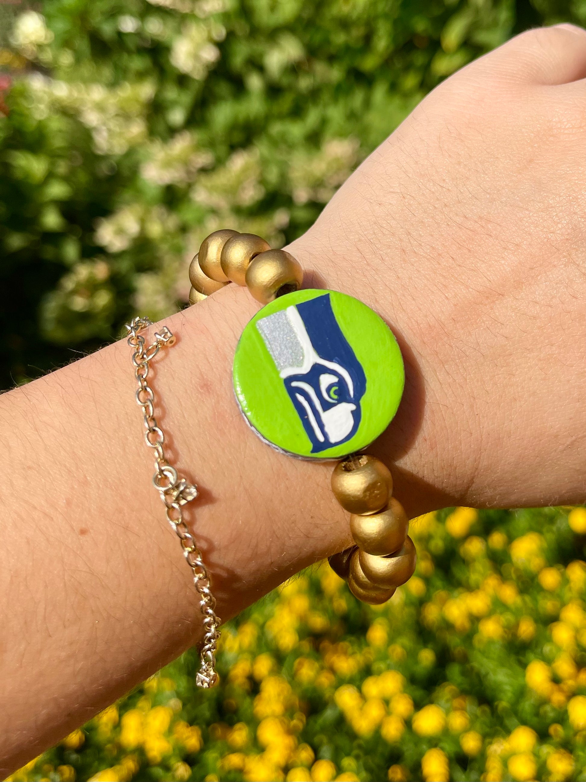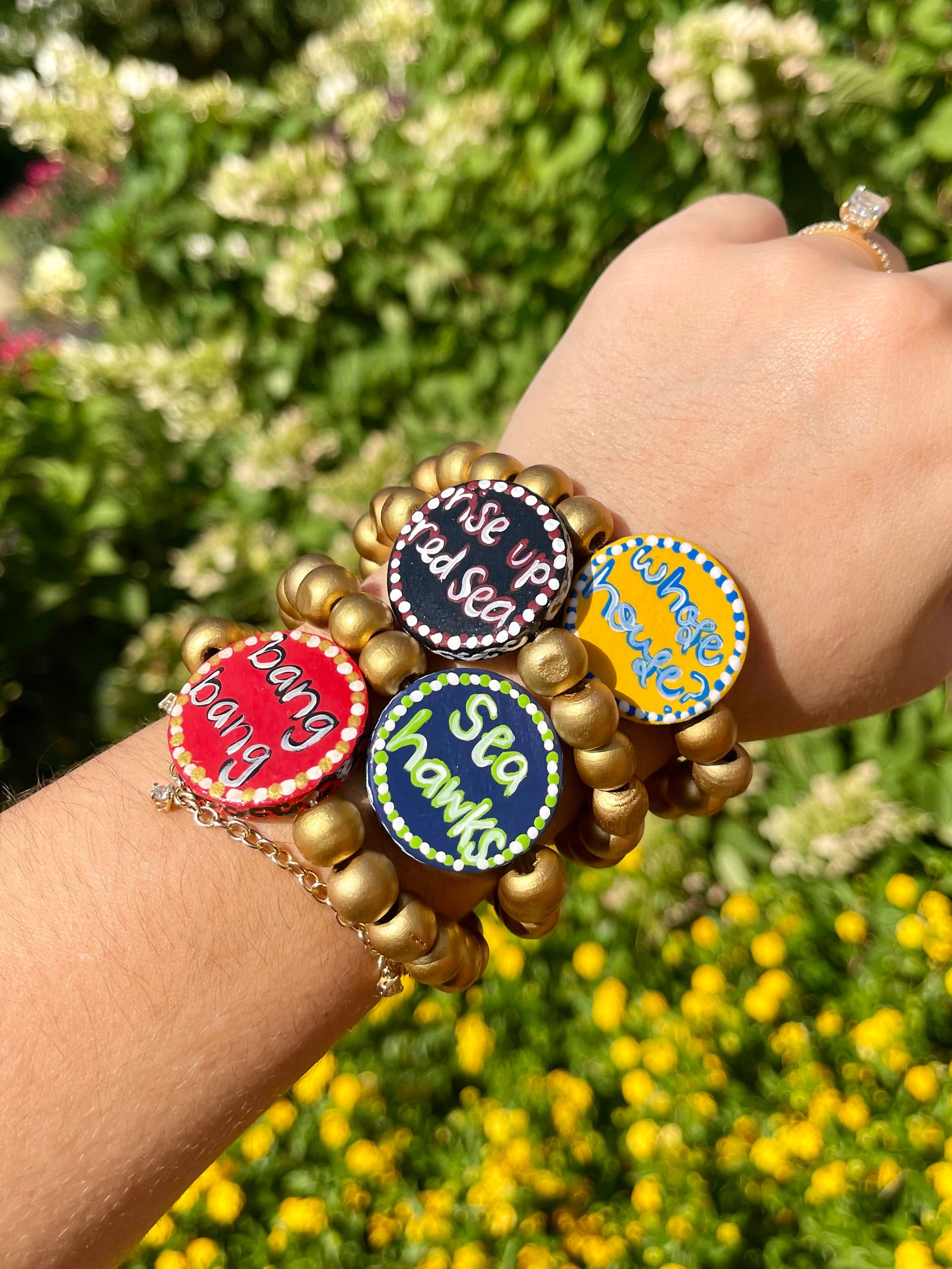 NFCW pro football flip bracelets. these hand painted bracelets have the team on one side and a popular phrase or chant on the other side. they are two bracelets for the price of one!