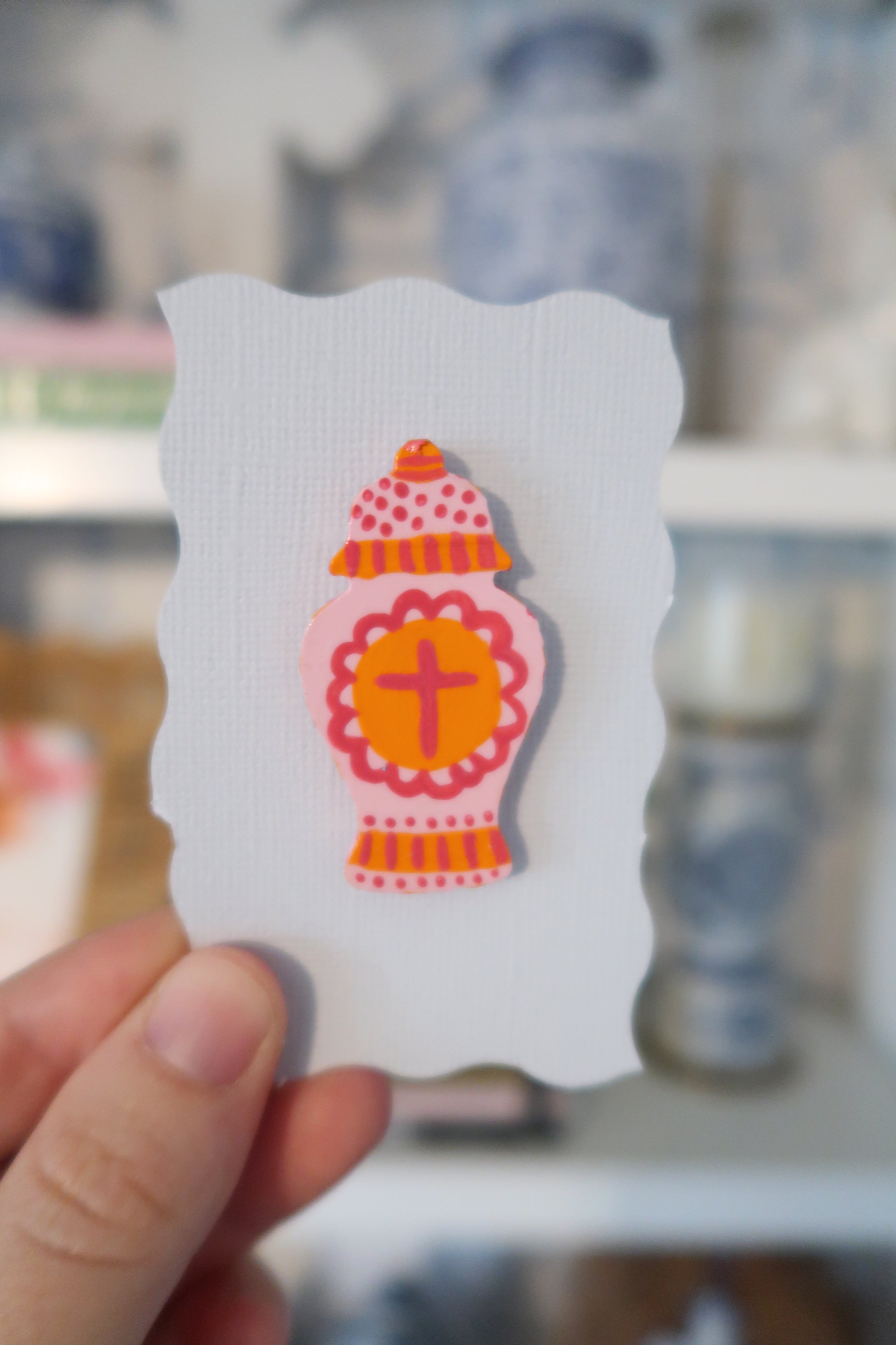 orange and pink hand painted ginger jar needle minder