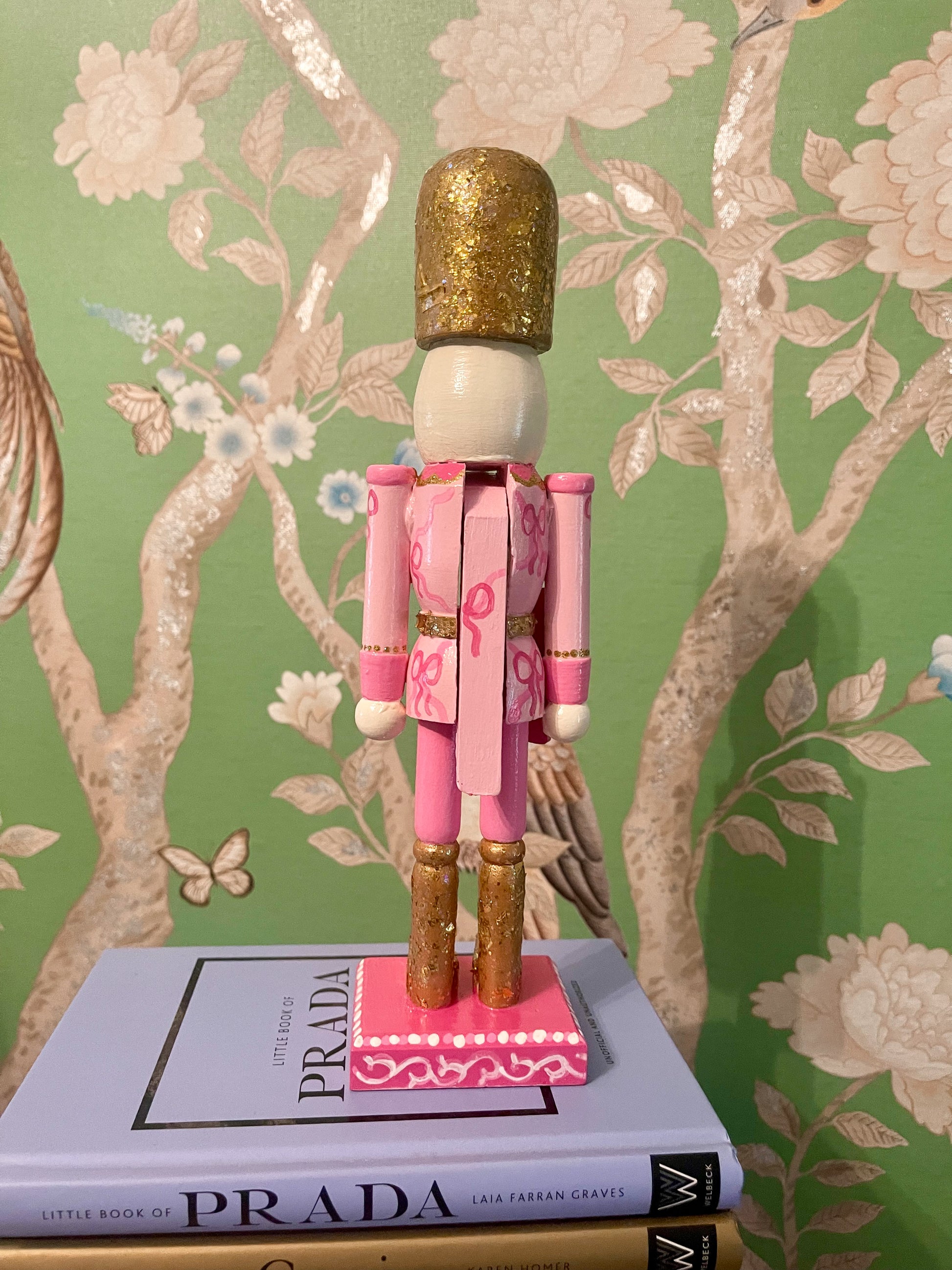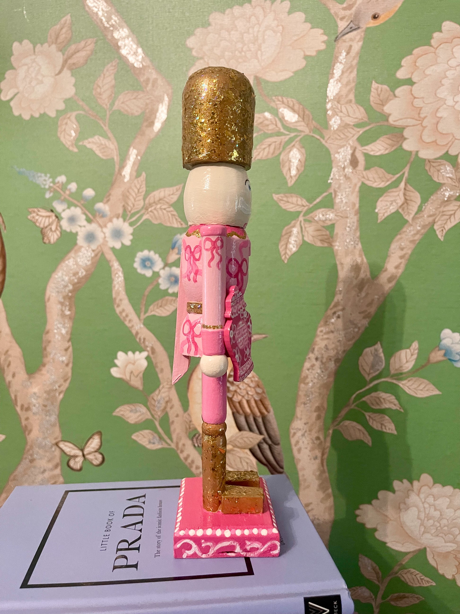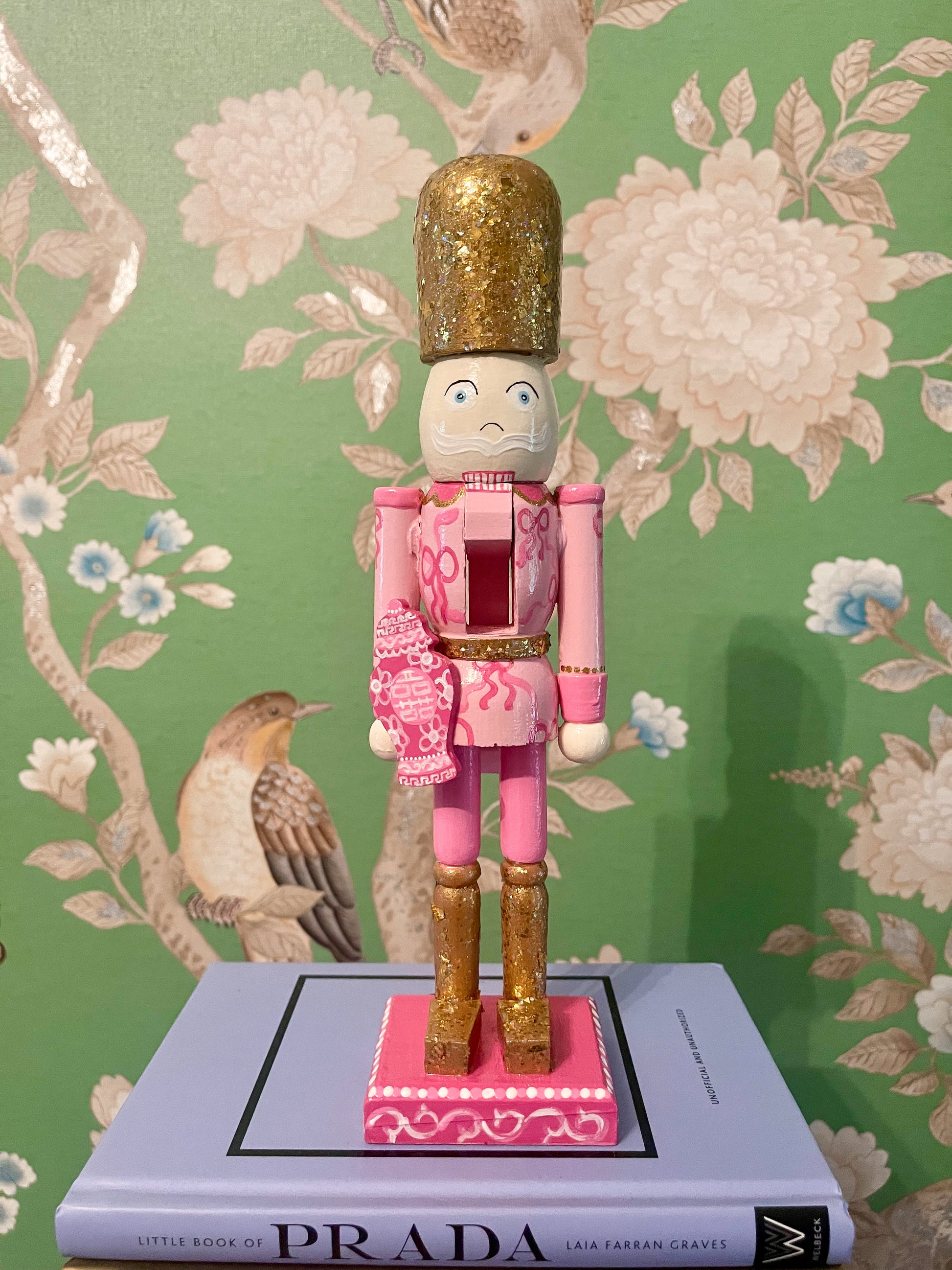 hand painted little pink nutcracker holding a double happiness ginger jar. he is so so cute and so fun! he is a one of a kind nutcracker and we only have one available so grab him while you can!